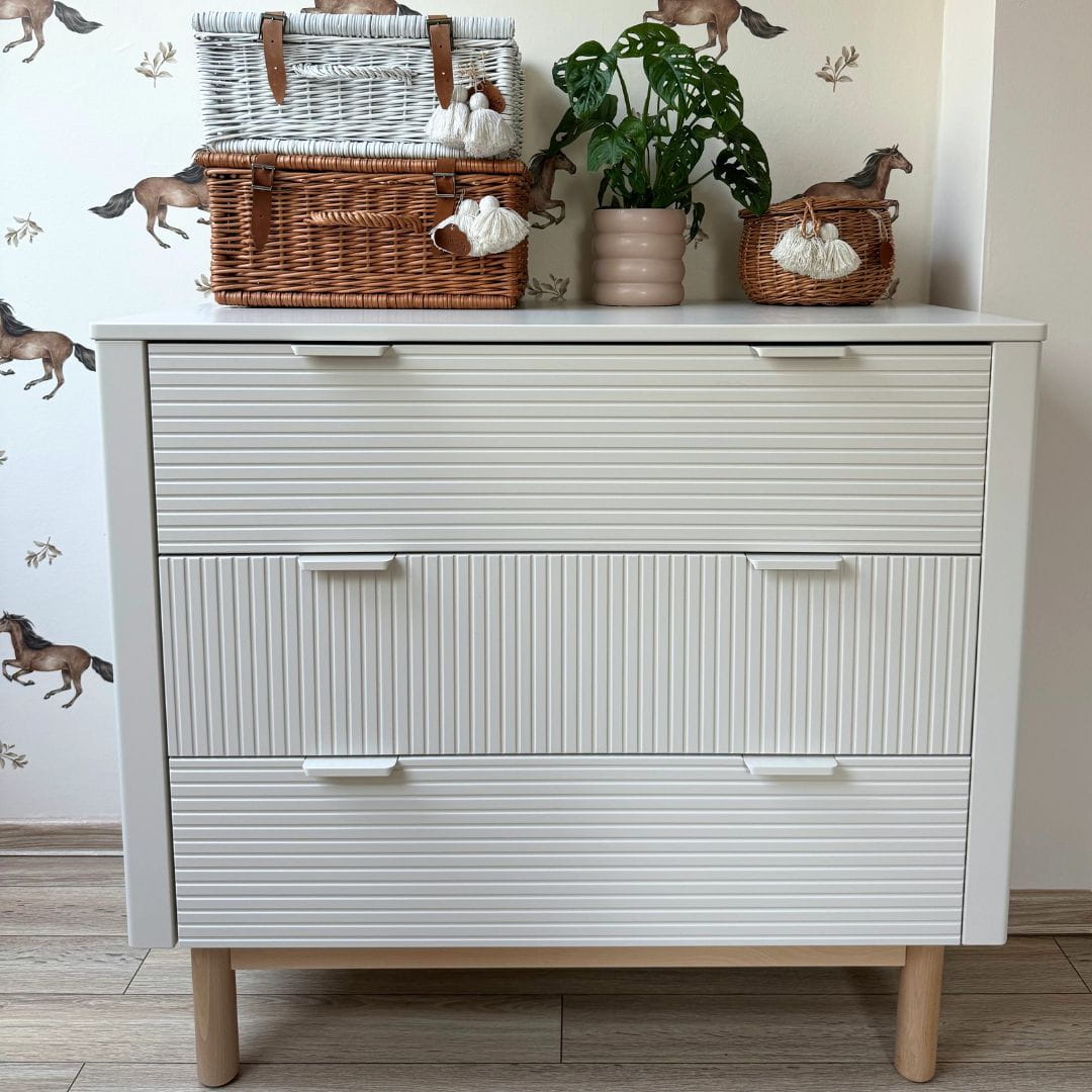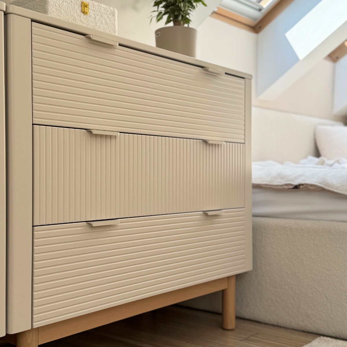 Stylowa komoda Miloo polskiej marki Pinio to idealne połączenie elegancji, funkcjonalności i bezpieczeństwa. Ryflowane fronty dodają komodzie charakteru i elegancji, czyniąc ją wyjątkowym elementem dekoracyjnym w każdym wnętrzu. Zaokrąglone narożniki zapewniają bezpieczeństwo, co jest szczególnie ważne w domach z małymi dziećmi. Metalowe uchwyty oraz drewniane bukowe nóżki nadają komodzie lekkości i finezji, wprowadzając do wnętrza nutę nowoczesnej elegancji.