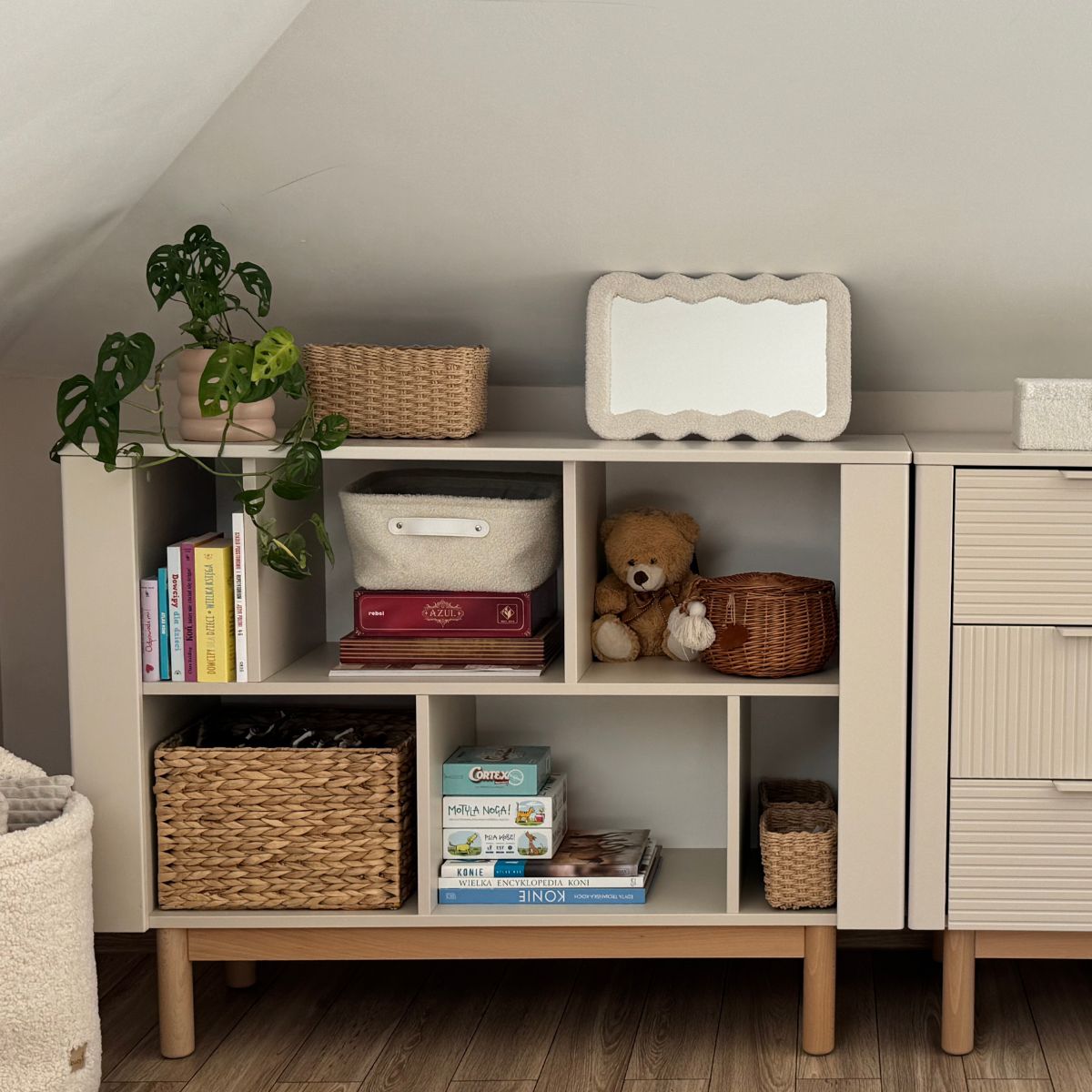Beżowy regał dla dziecka Miloo - funkcjonalny i przemyślany design