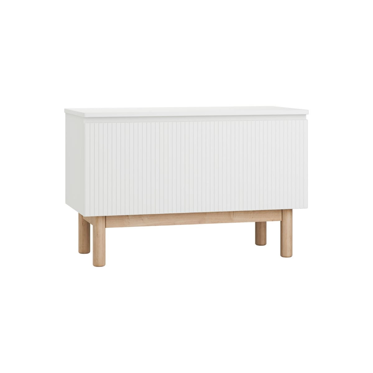 Całość wieńczy stylowa forma: lekkie, bukowe nóżki oraz delikatne, metalowe uchwyty, które nadają meblowi lekkości i finezji. To nie tylko funkcjonalne miejsce do przechowywania zabawek, książek czy dziecięcych skarbów, ale również piękna ozdoba wnętrza.