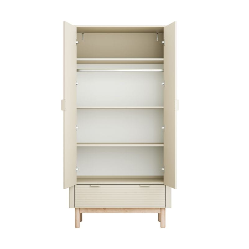 Wnętrze szafy Miloo zostało zaprojektowane z myślą o maksymalnej funkcjonalności. Znajdziesz tu trzy przestronne półki oraz drążek do wieszania ubrań, co umożliwia wygodne i uporządkowane przechowywanie garderoby. Szafa posiada także pojemną szufladę, dzięki czemu zyskasz jeszcze więcej miejsca do przechowywania.