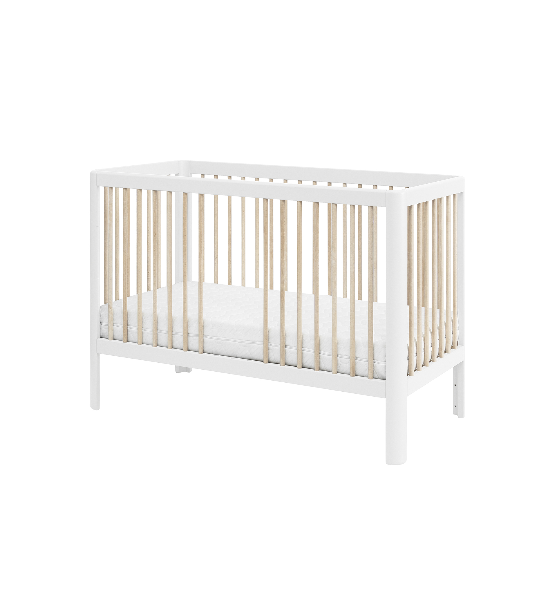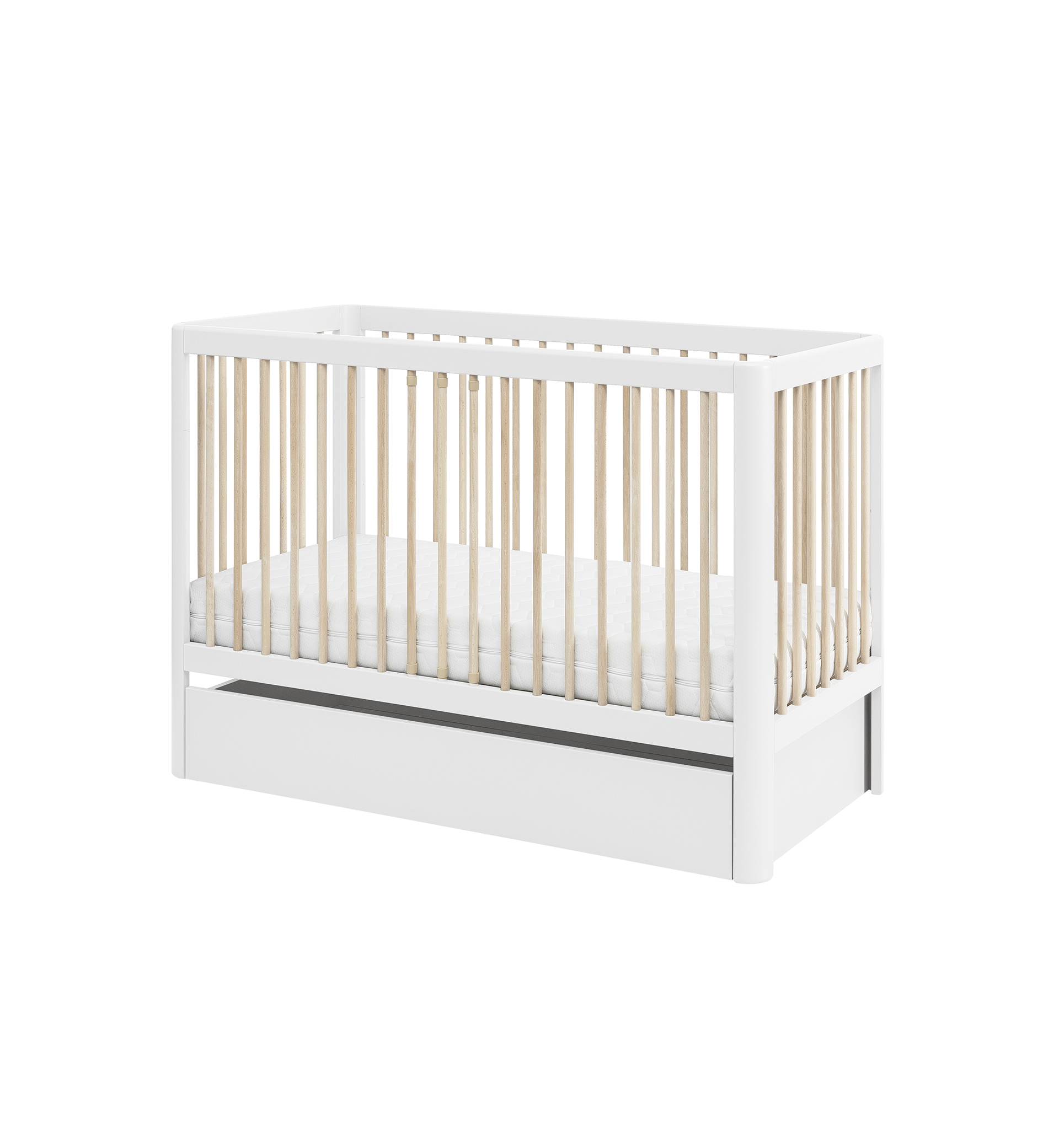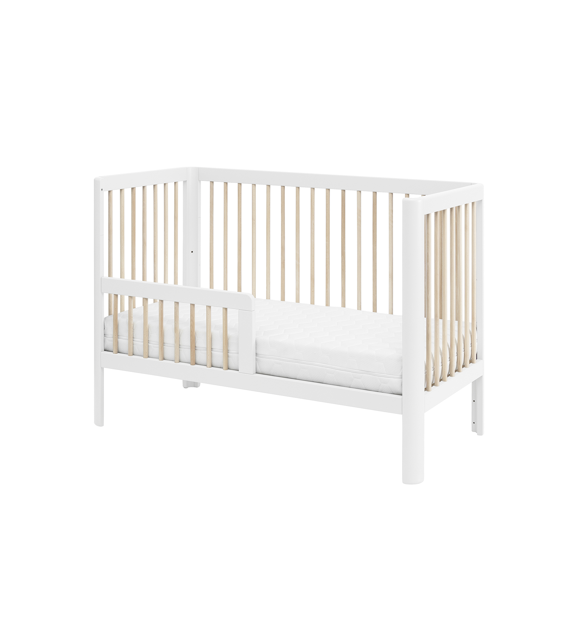 Designerskie łóżeczko niemowlęce Pure z zaokrąglonymi bokami posiada 3 poziomy wysokości materaca, wyjmowane 3 drążki oraz możliwość demontażu jednego boku, dzięki czemu pełni wtedy funkcję otwartego tapczanika dla większego dziecka.