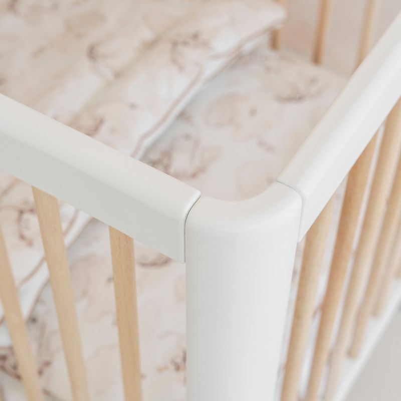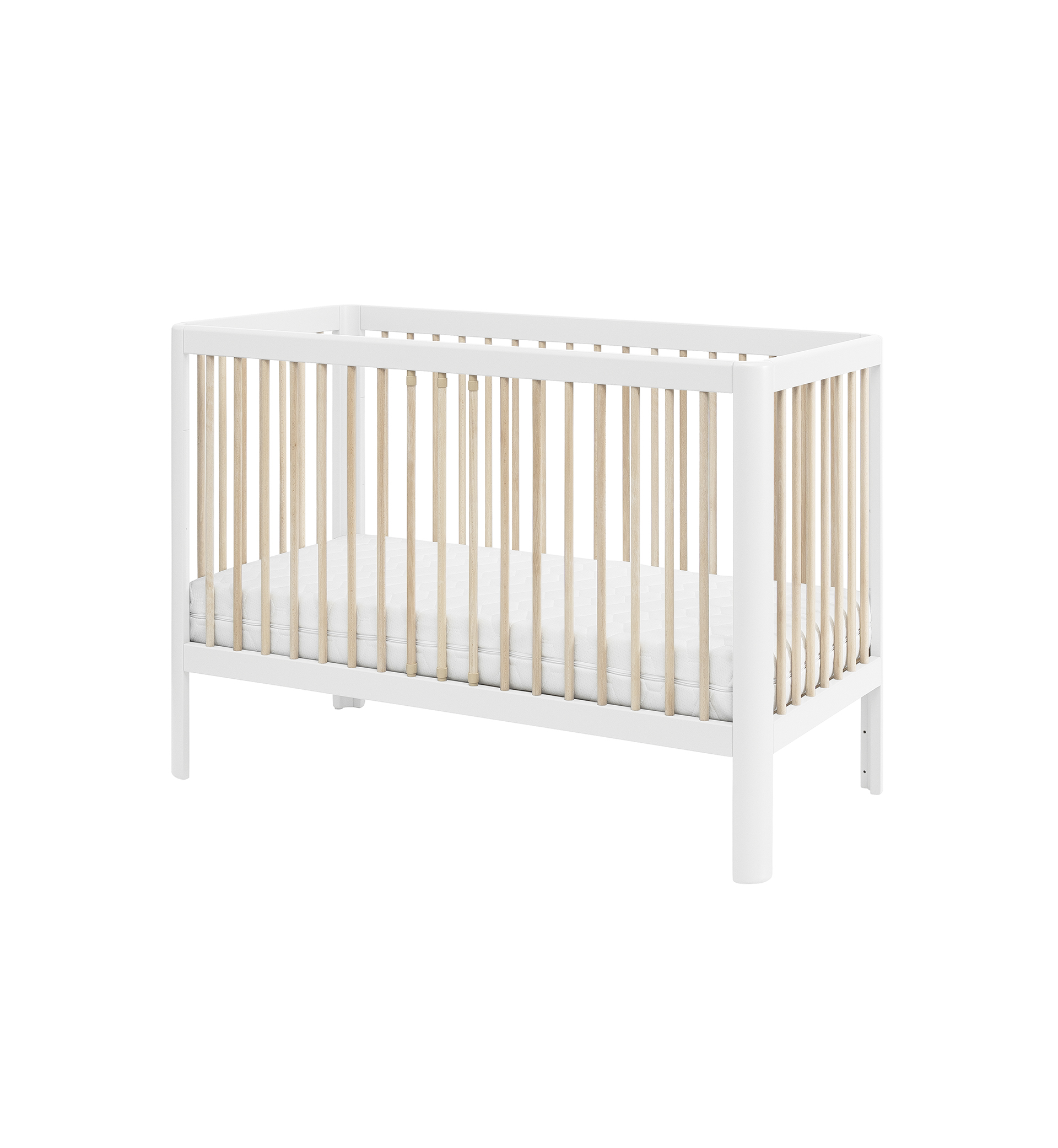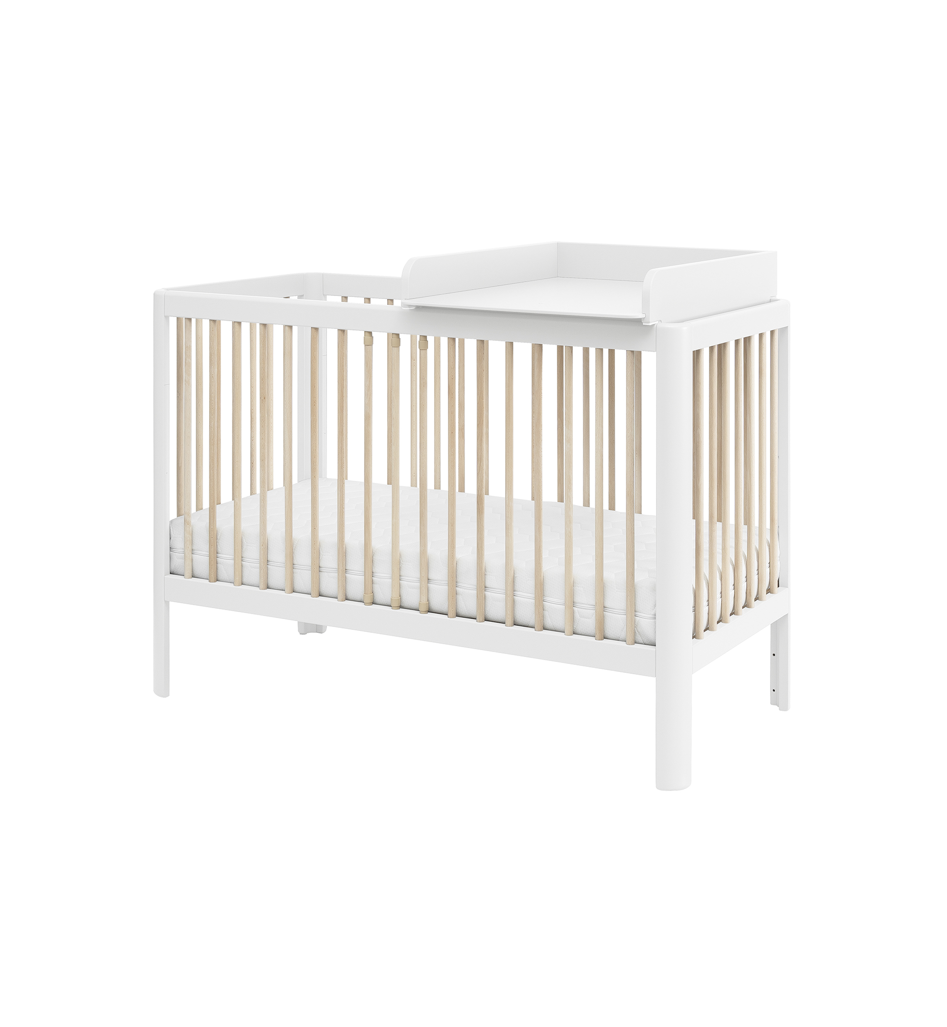 Designerskie łóżeczko niemowlęce Pure z zaokrąglonymi bokami posiada 3 poziomy wysokości materaca, wyjmowane 3 drążki oraz możliwość demontażu jednego boku, dzięki czemu pełni wtedy funkcję otwartego tapczanika dla większego dziecka.