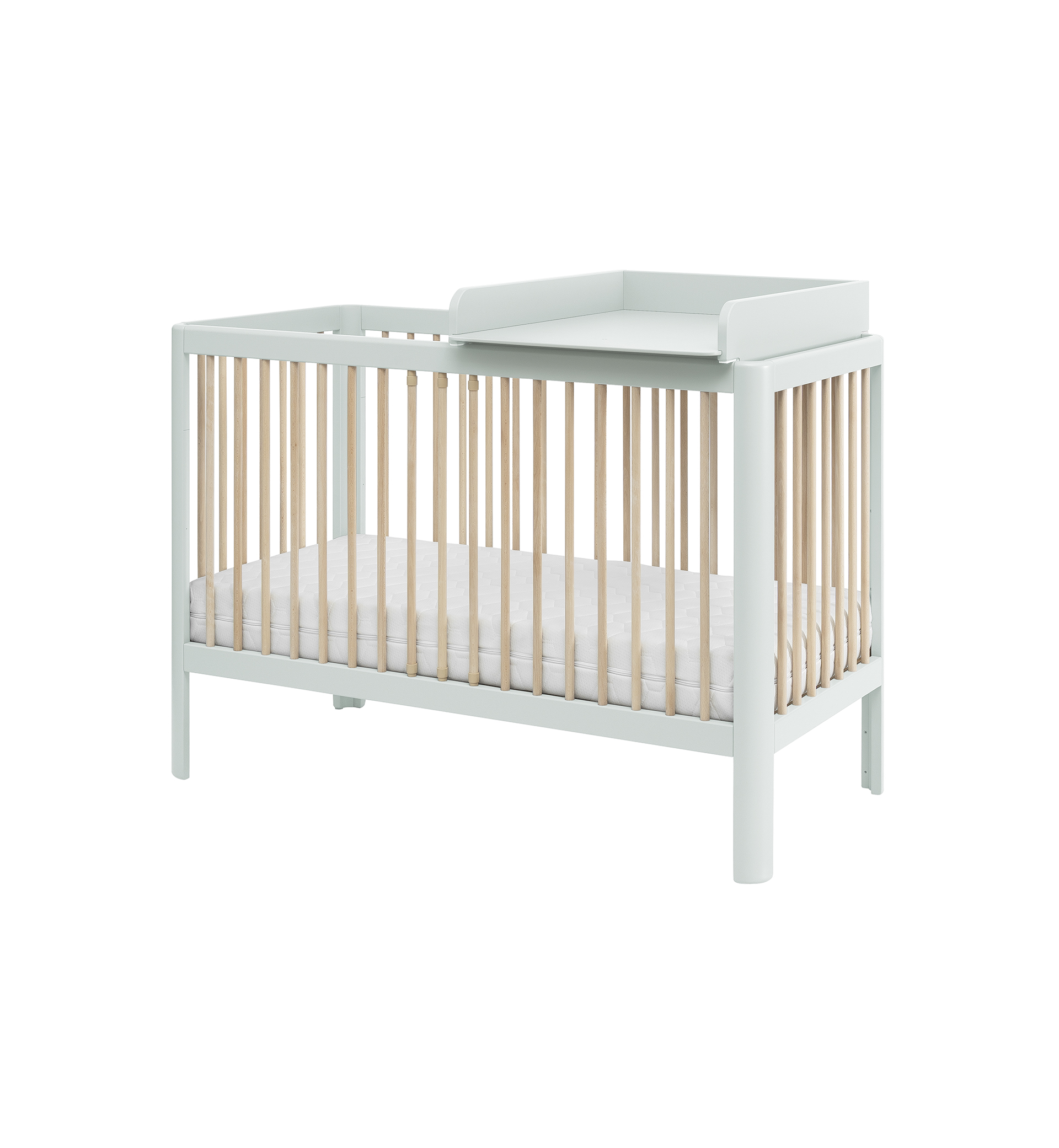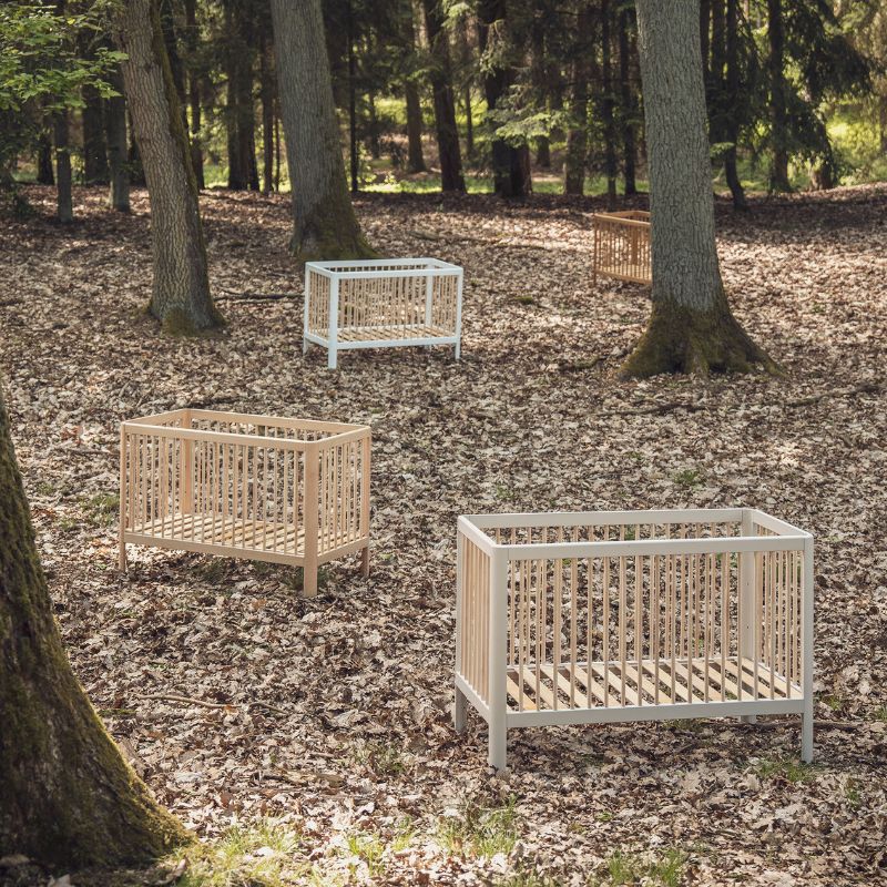 Designerskie łóżeczko niemowlęce Pure z zaokrąglonymi bokami posiada 3 poziomy wysokości materaca, wyjmowane 3 drążki oraz możliwość demontażu jednego boku, dzięki czemu pełni wtedy funkcję otwartego tapczanika dla większego dziecka.
