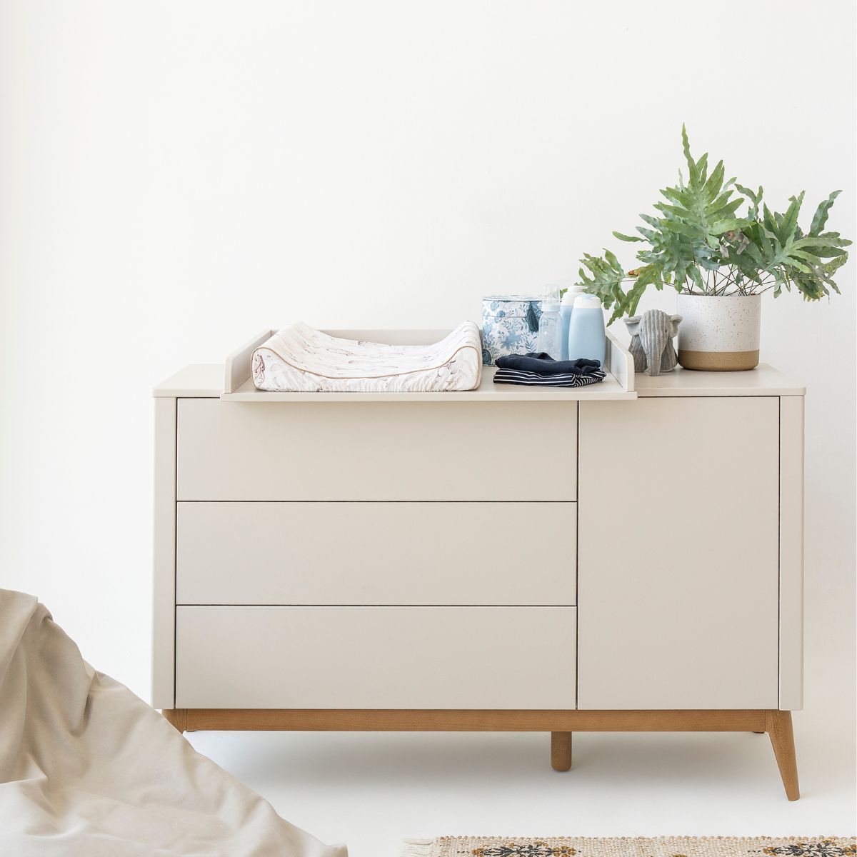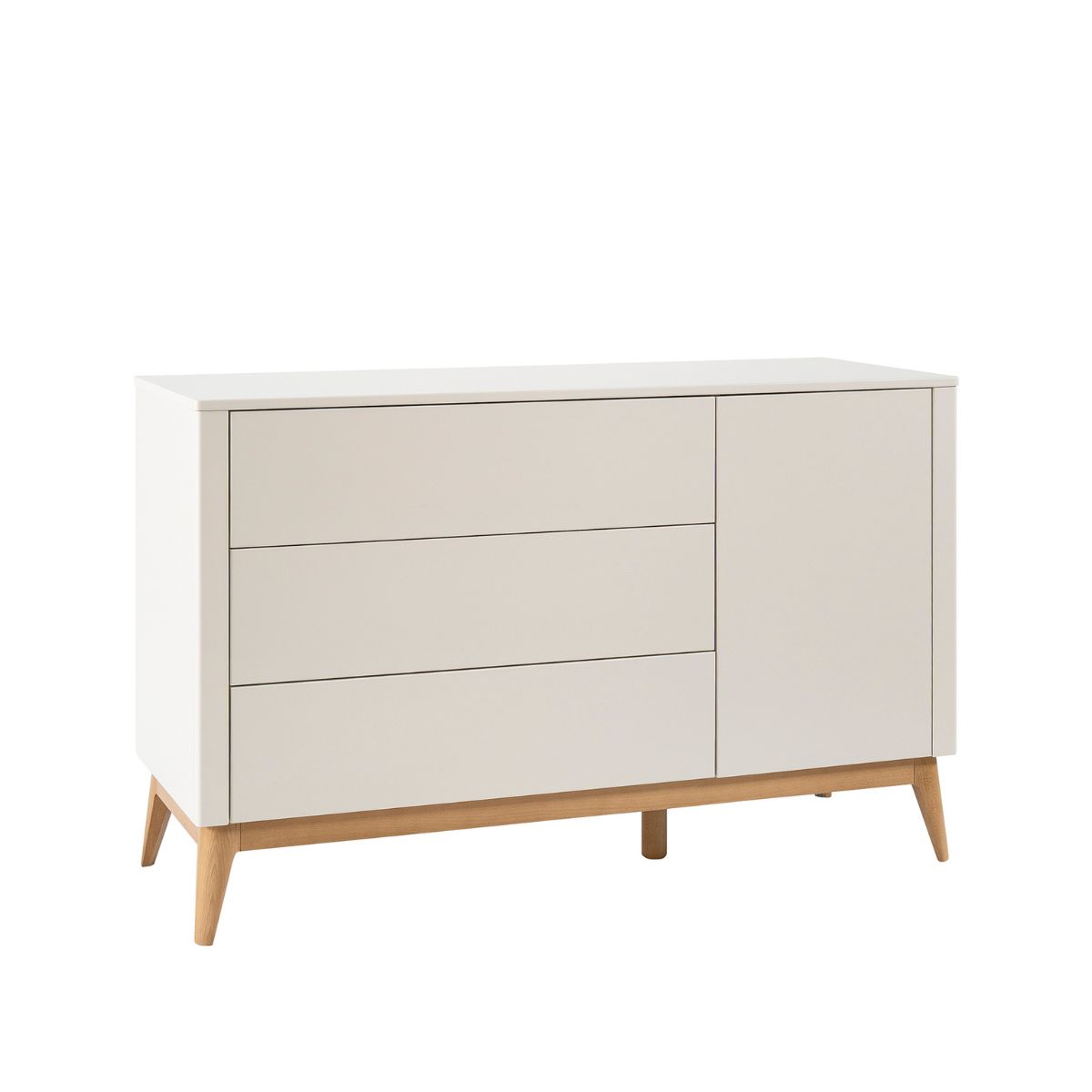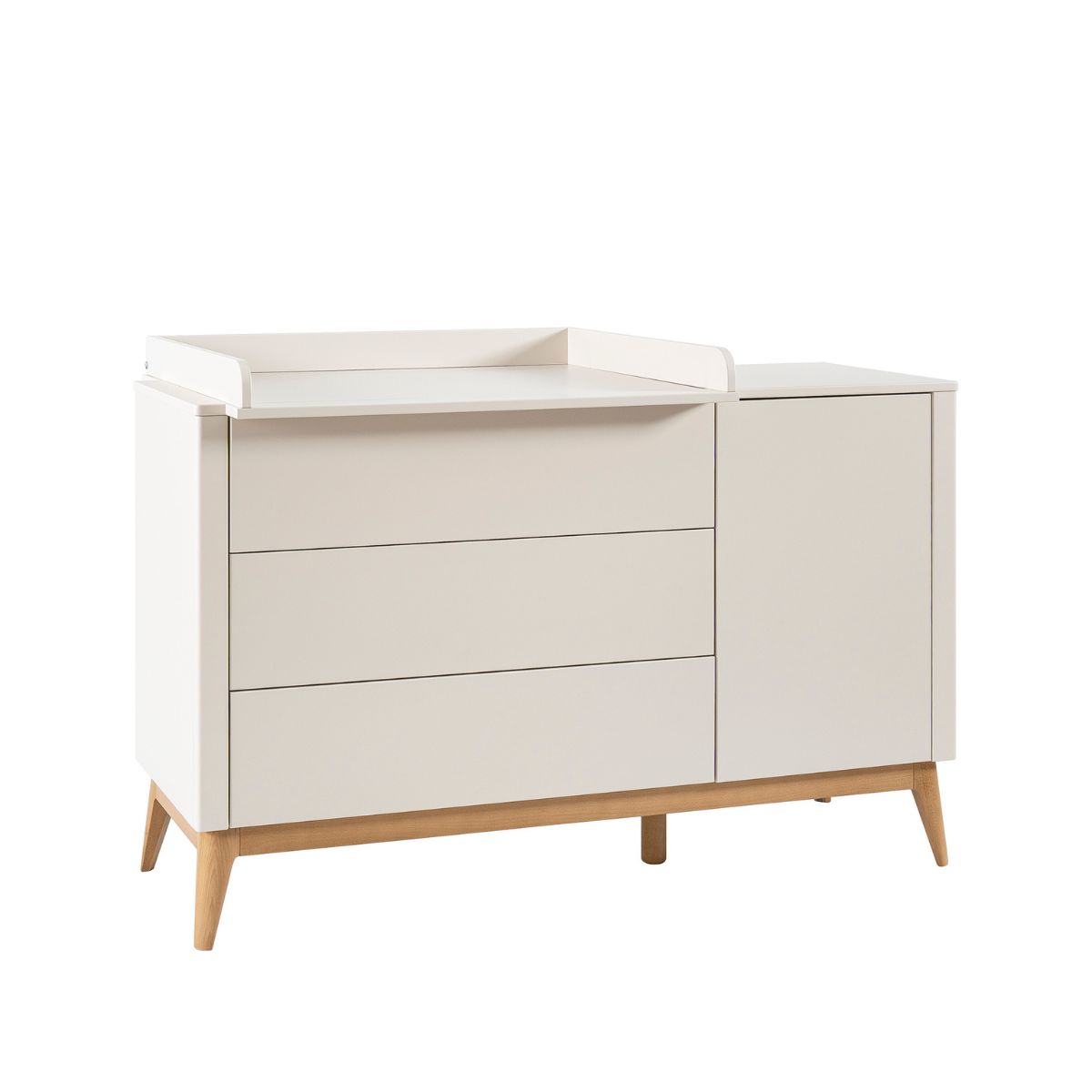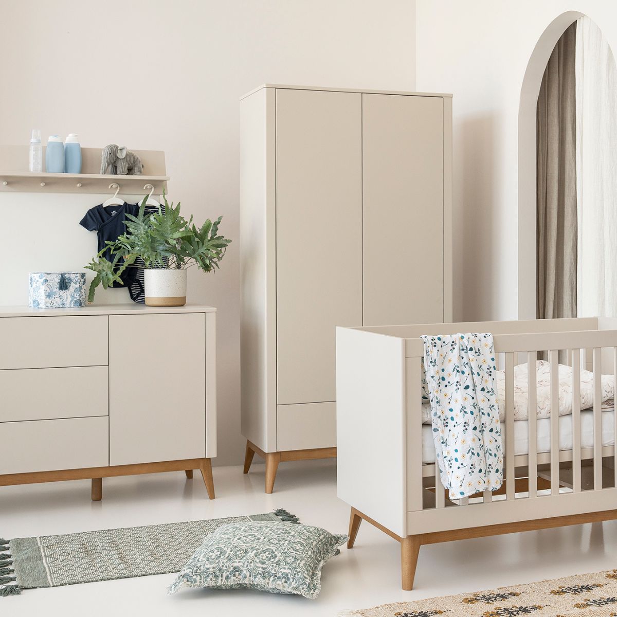 Kolekcja Seth to zestaw mebli dziecięcych, który łączy minimalistyczny design z ciepłem naturalnych materiałów. Dominują w niej delikatne, szampańskie odcienie połączone z nogami z jasnego drewna, które nadają całości lekkości i przytulnego charakteru.
