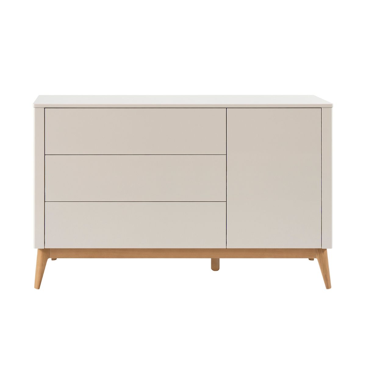 Korpus komody wykonano z wytrzymałej, laminowanej płyty wiórowej oraz malowanej płyty MDF, co zapewnia trwałość i odporność na codzienne użytkowanie. Stabilne nóżki z litego drewna bukowego dodają meblowi elegancji i stabilności.