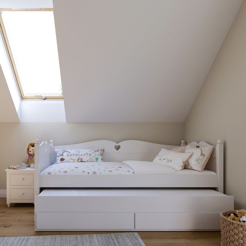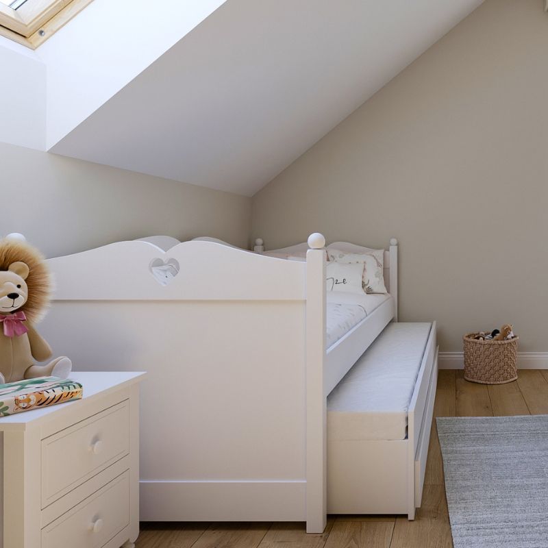 To, co wyróżnia łóżko Bella, to subtelne, ozdobne wycięcia w kształcie serduszek. Te finezyjne detale umieszczone na szczytach łóżka sprawiają, że mebel zyskuje lekkość i niezwykle przytulny, romantyczny sznyt. Serduszka nie tylko pełnią funkcję estetyczną, podkreślając luksusowy charakter kolekcji premium, ale stanowią też uroczy akcent, który sprawi, że Twoje dziecko poczuje się w swoim pokoju naprawdę wyjątkowo. To idealny wybór dla małych marzycielek, które kochają detale dopracowane w każdym calu.