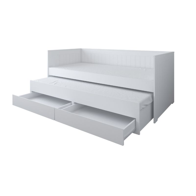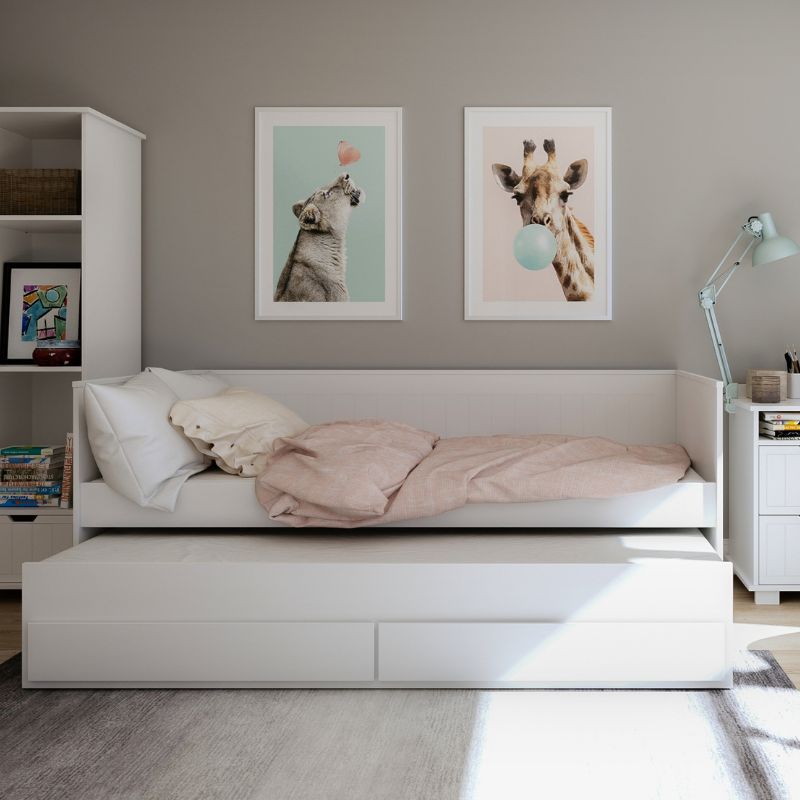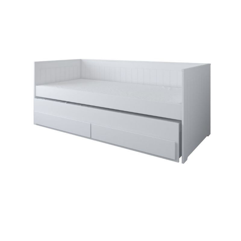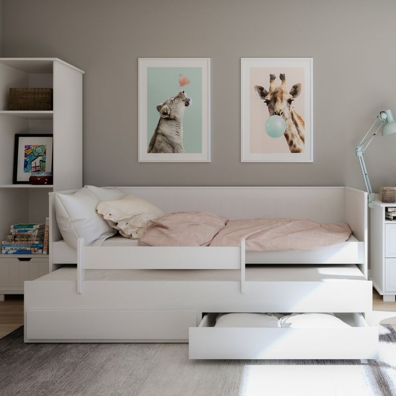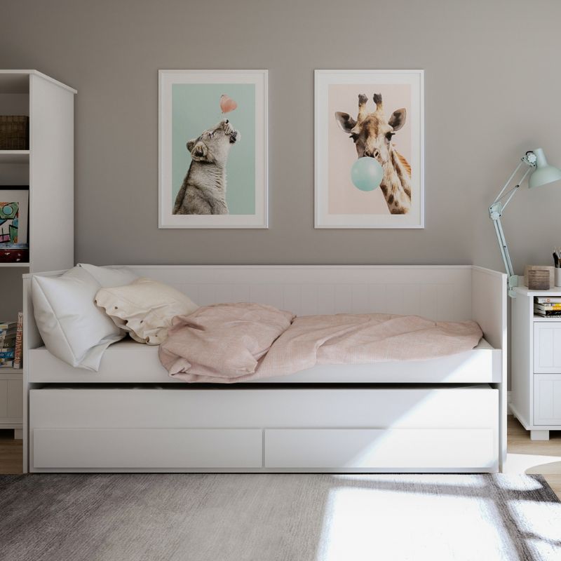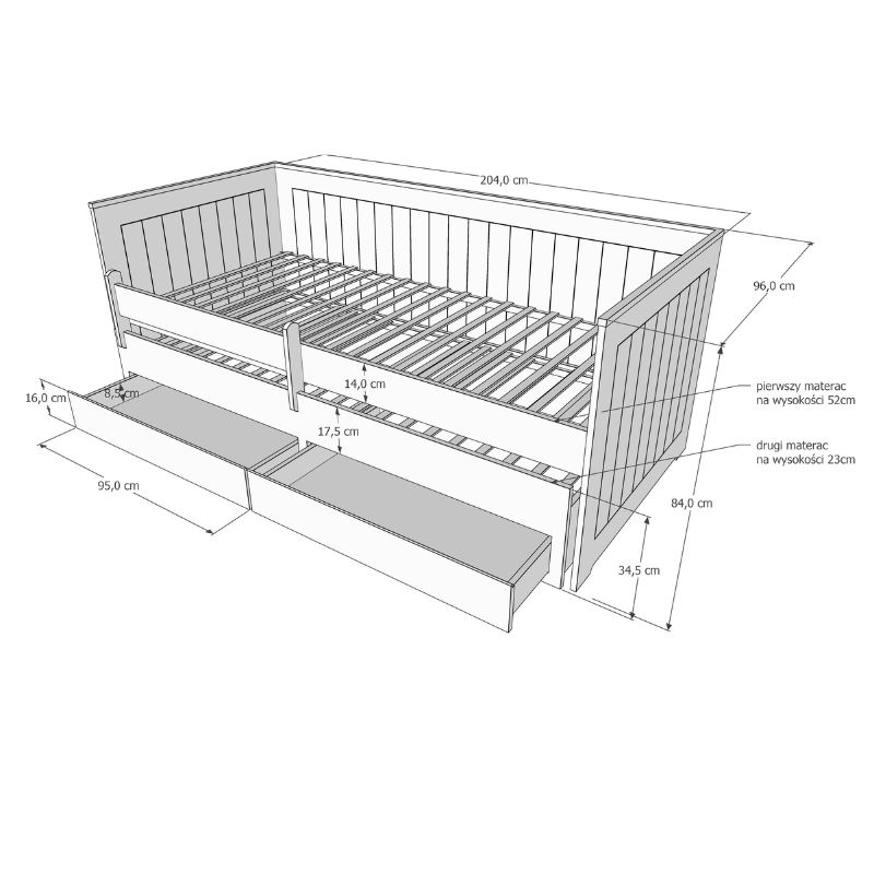 Zapomnij o bałaganie! Pod wysuwaną ramą ukryte zostały dwie pojemne szuflady na prowadnicach, które idealnie sprawdzą się jako schowek na pościel, sezonowe ubrania czy ulubione zabawki.