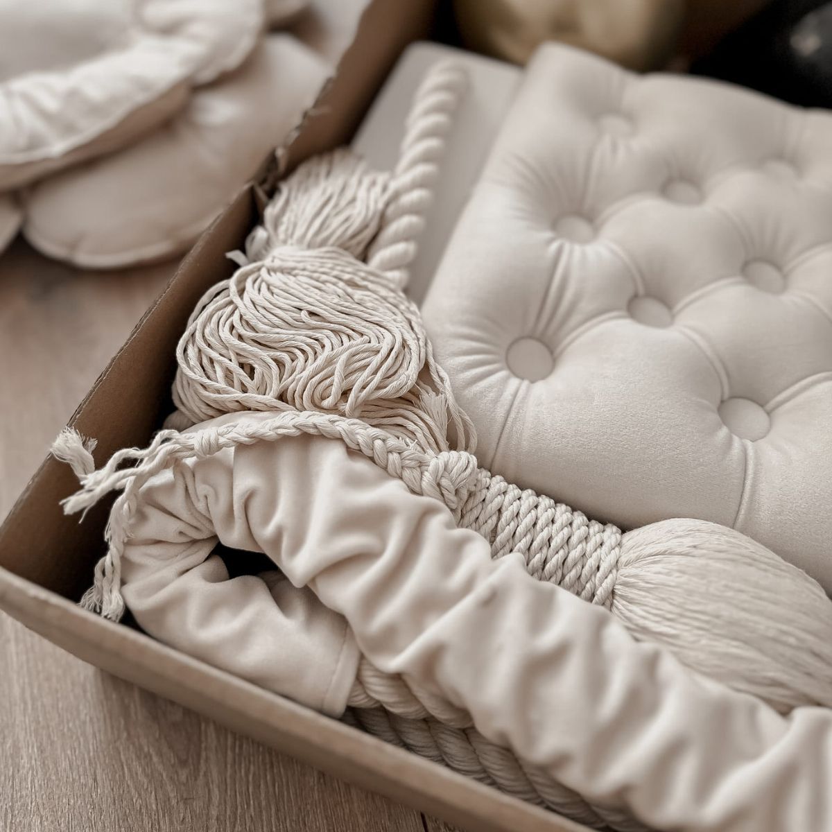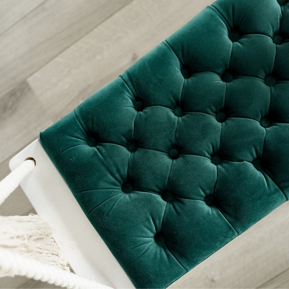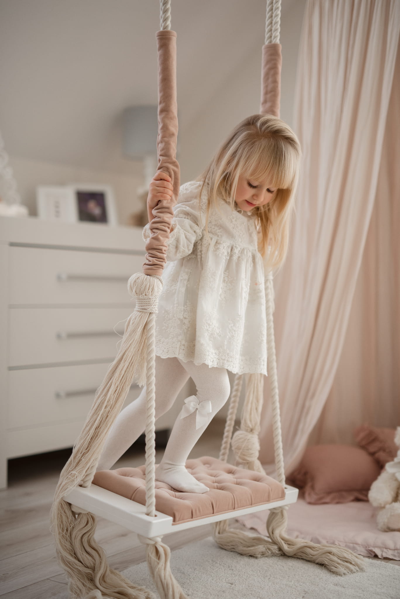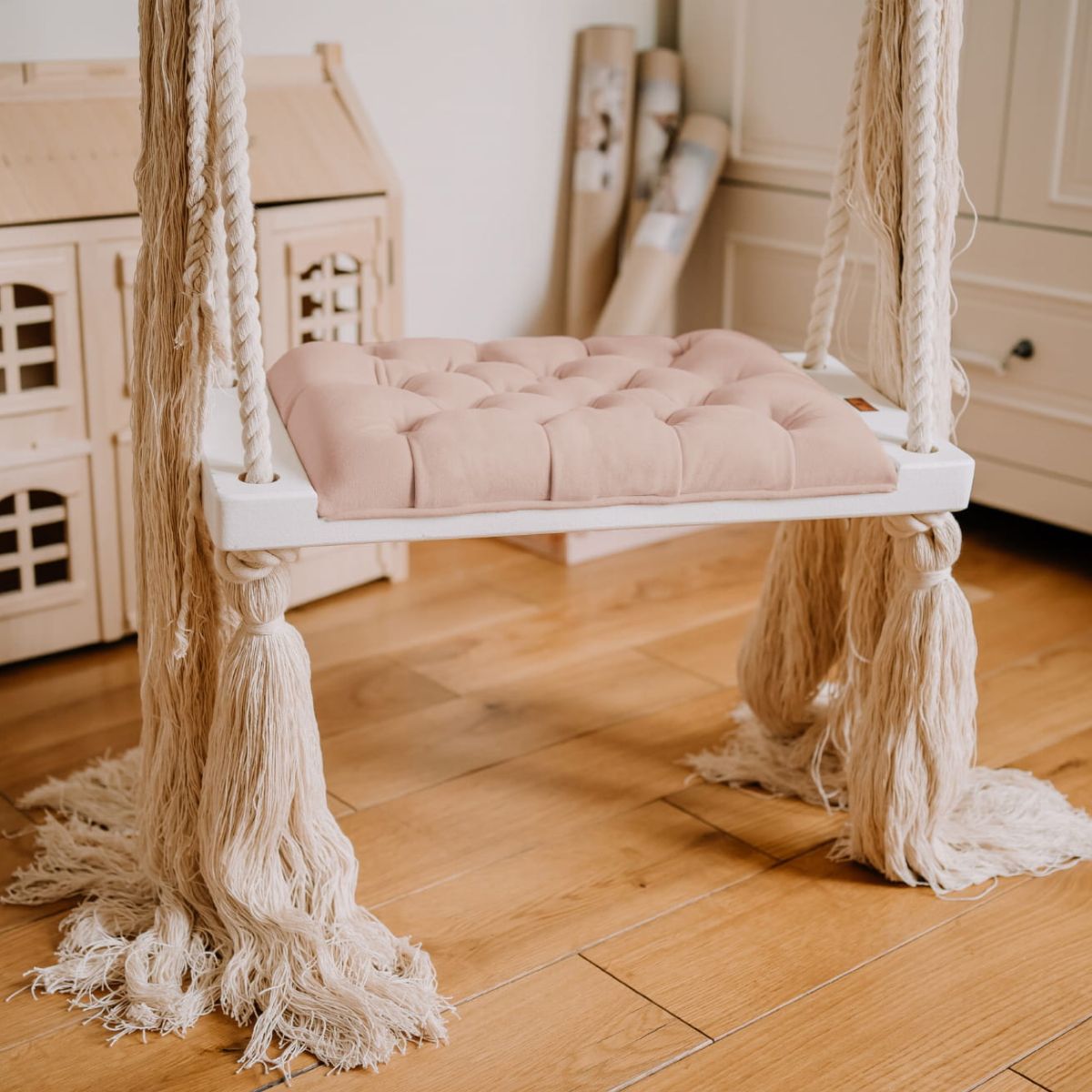 Huśtawka dziecięca domowa charakteryzuje się siedziskiem z gęstym pikowaniem guzikami, które nadaje eleganckiego i luksusowego wyglądu. Dzięki głębokiemu osadzeniu guzików, nie ma obawy o brak wygody podczas korzystania z huśtawki. Grube, podwójne bawełniane liny, na których zawieszona jest huśtawka, częściowo osłonięte są materiałowymi ochraniaczami. Pod siedziskiem liny zakończone są dekoracyjnymi chwostami, które podkreślają lekki i naturalny charakter produktu.