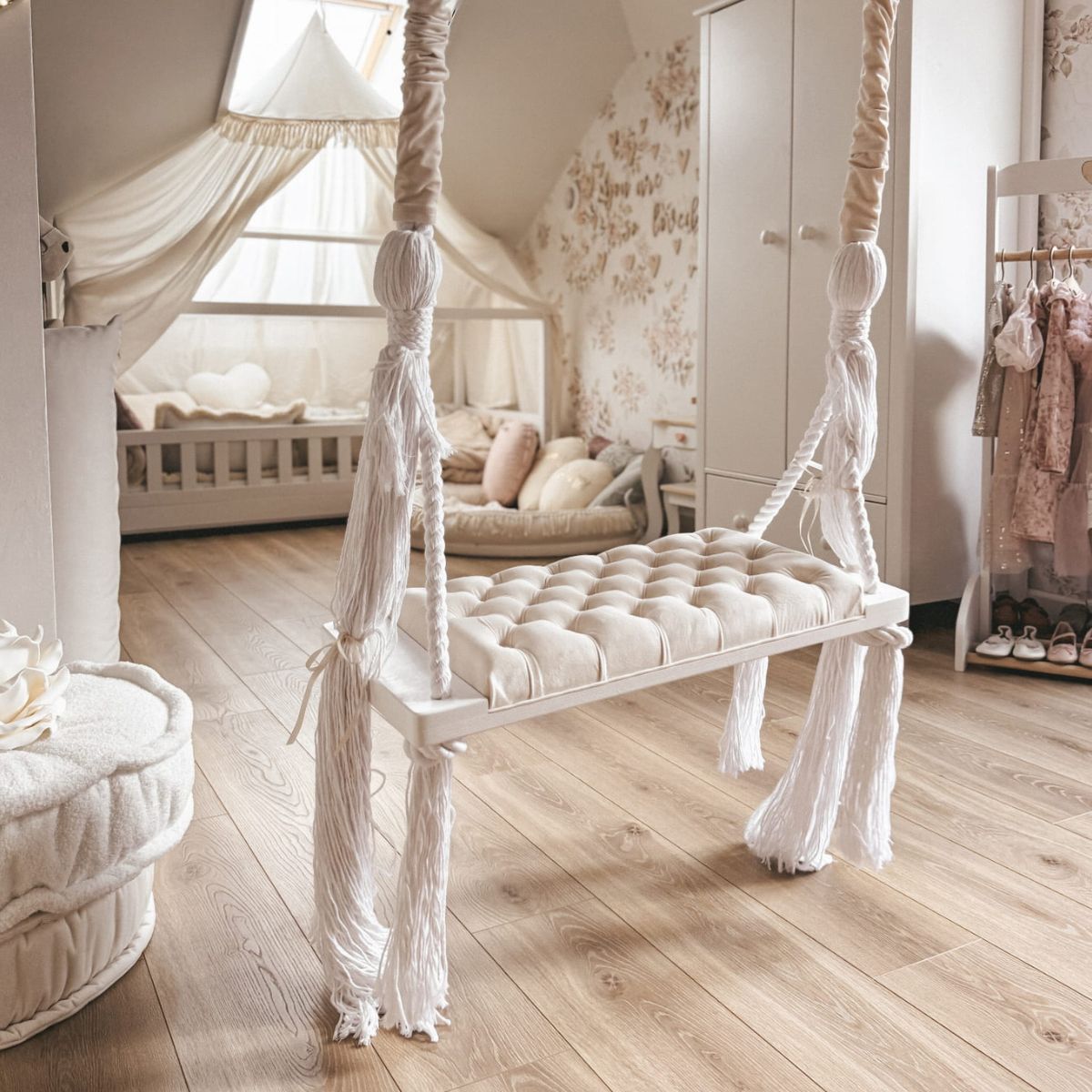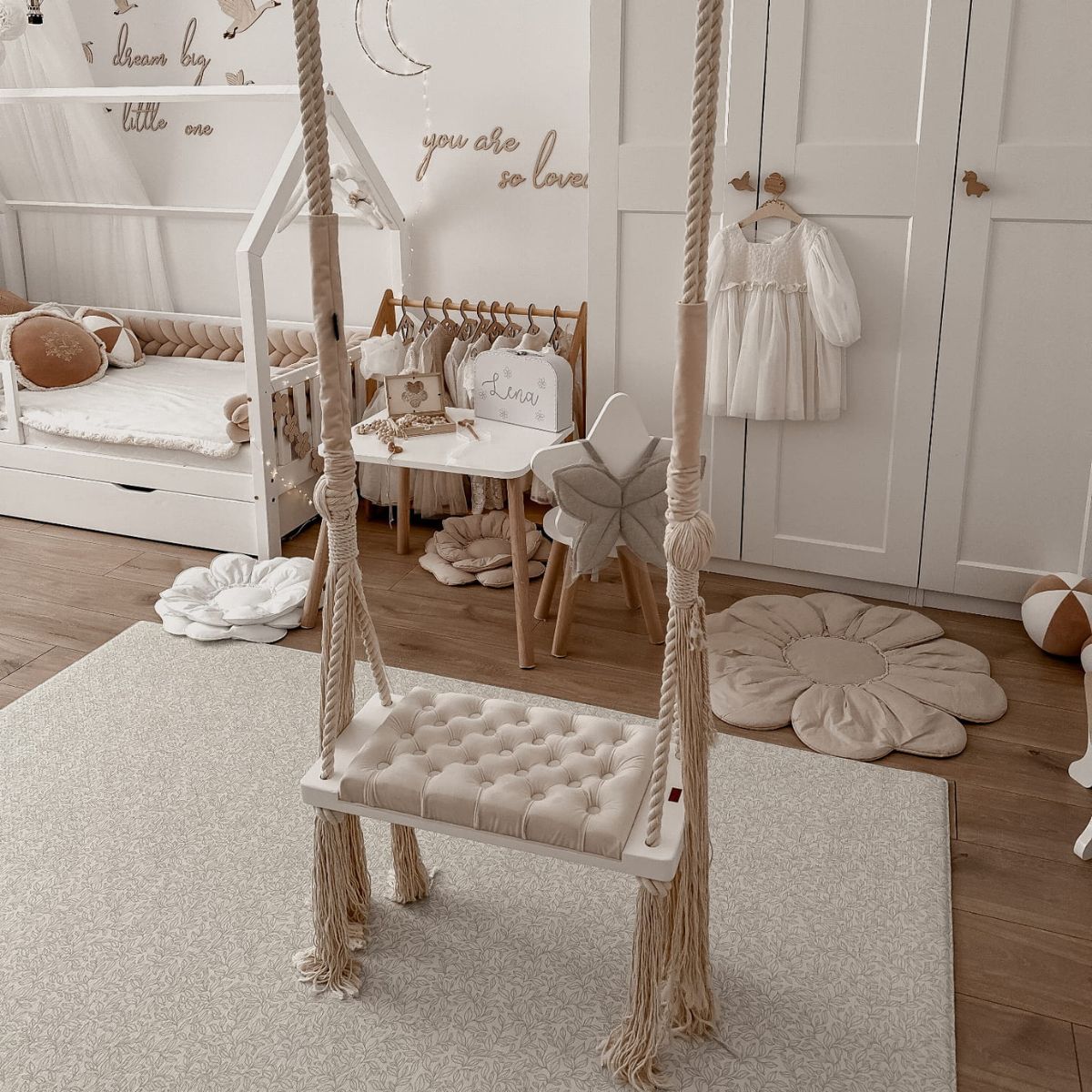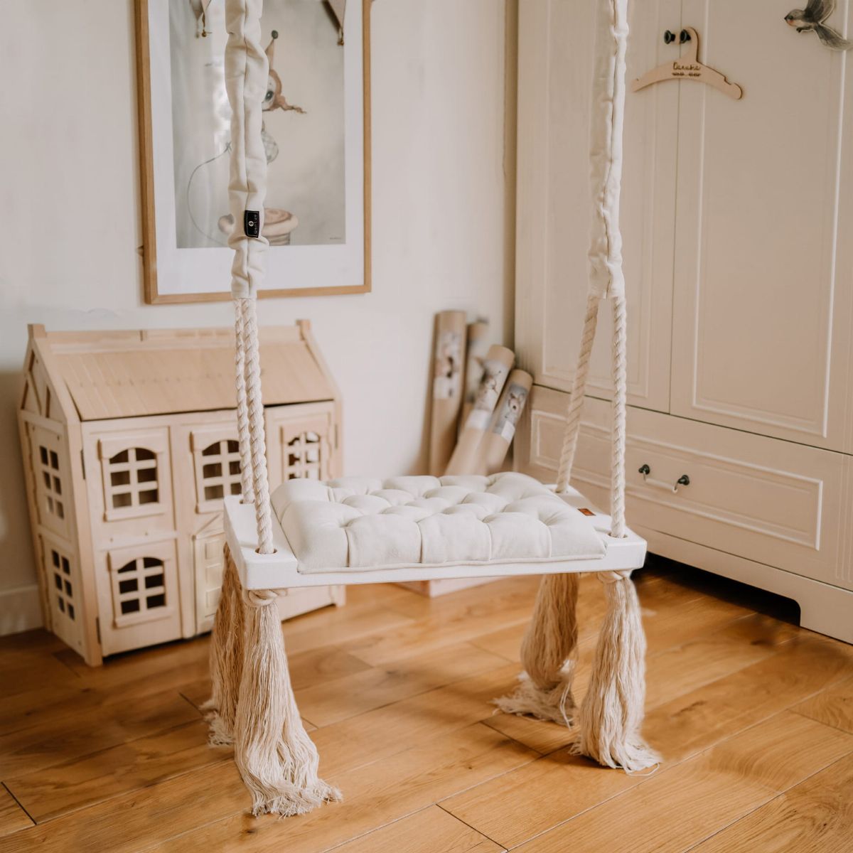 Huśtawka została zaprojektowana w minimalistycznym, skandynawskim stylu, dzięki czemu doskonale pasuje do nowoczesnych wnętrz, pokojów dziecięcych, salonów czy przestrzeni zabaw.