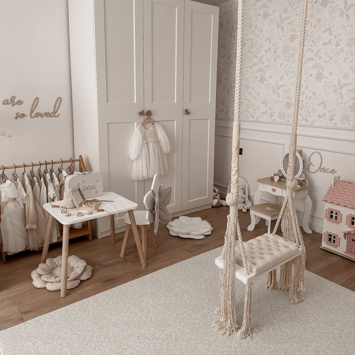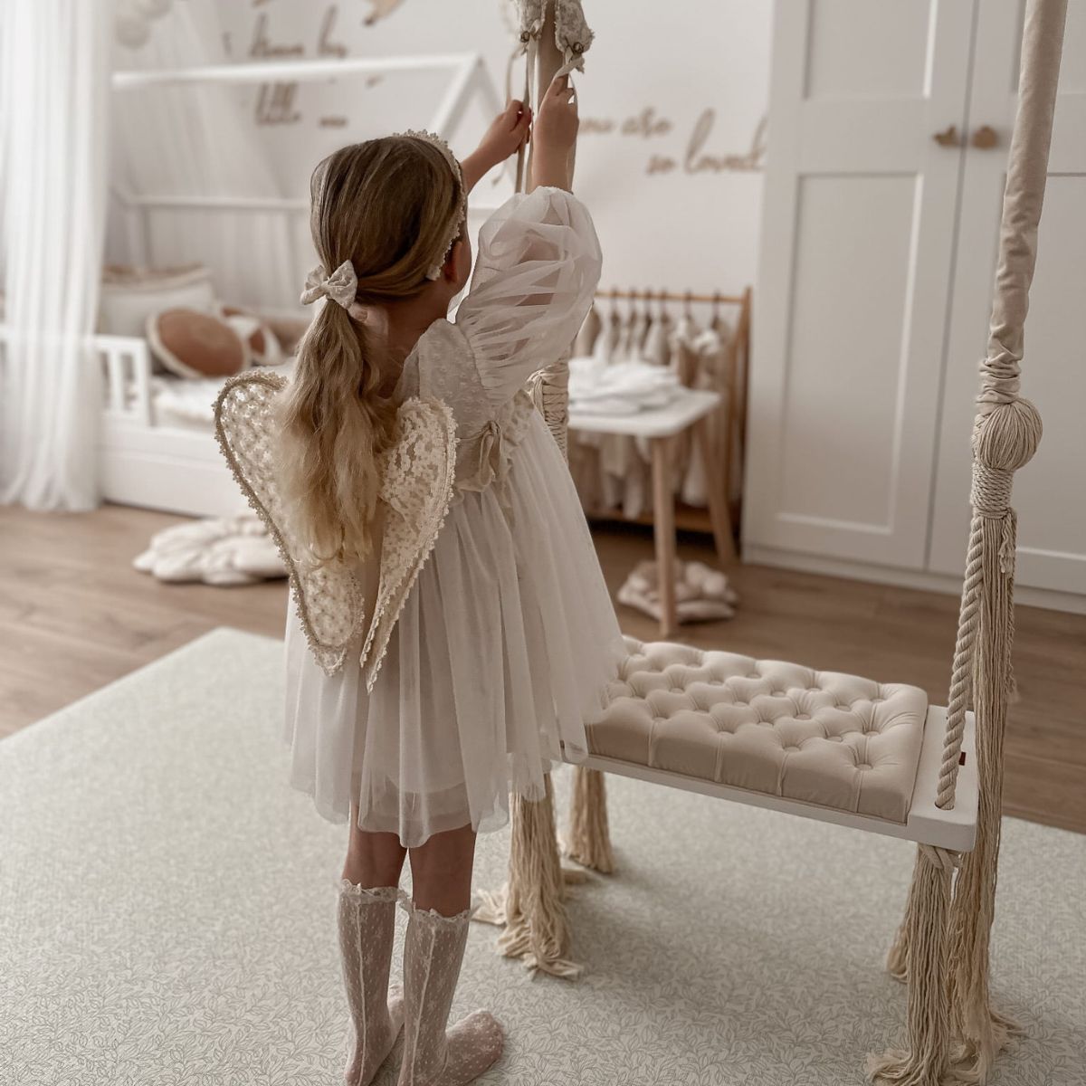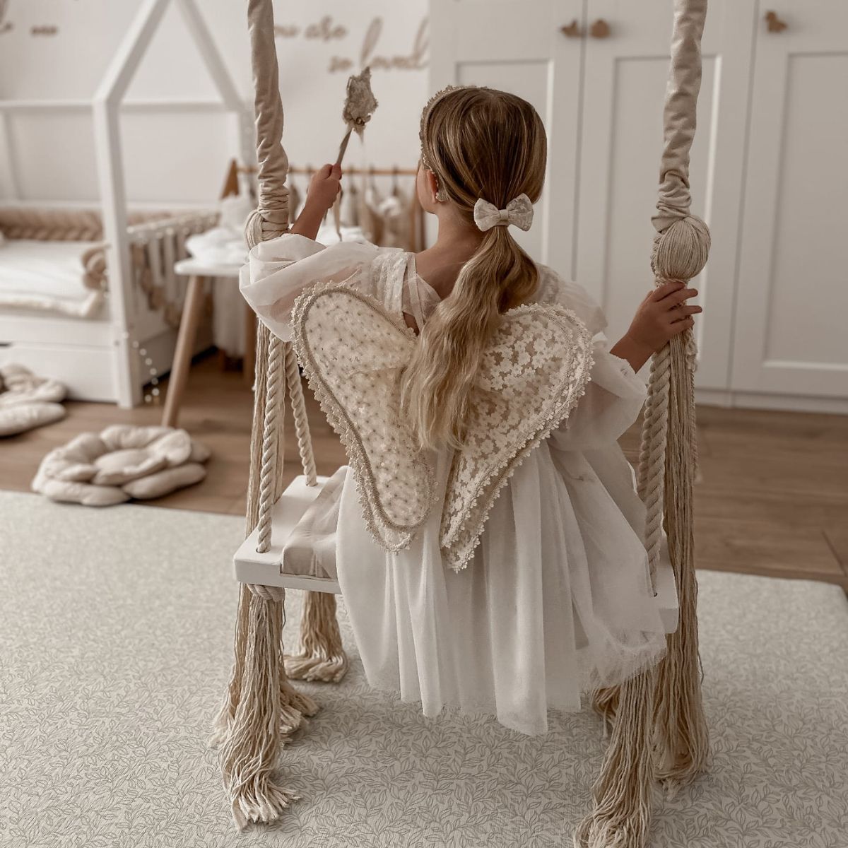 Huśtawka została zaprojektowana w minimalistycznym, skandynawskim stylu, dzięki czemu doskonale pasuje do nowoczesnych wnętrz, pokojów dziecięcych, salonów czy przestrzeni zabaw.