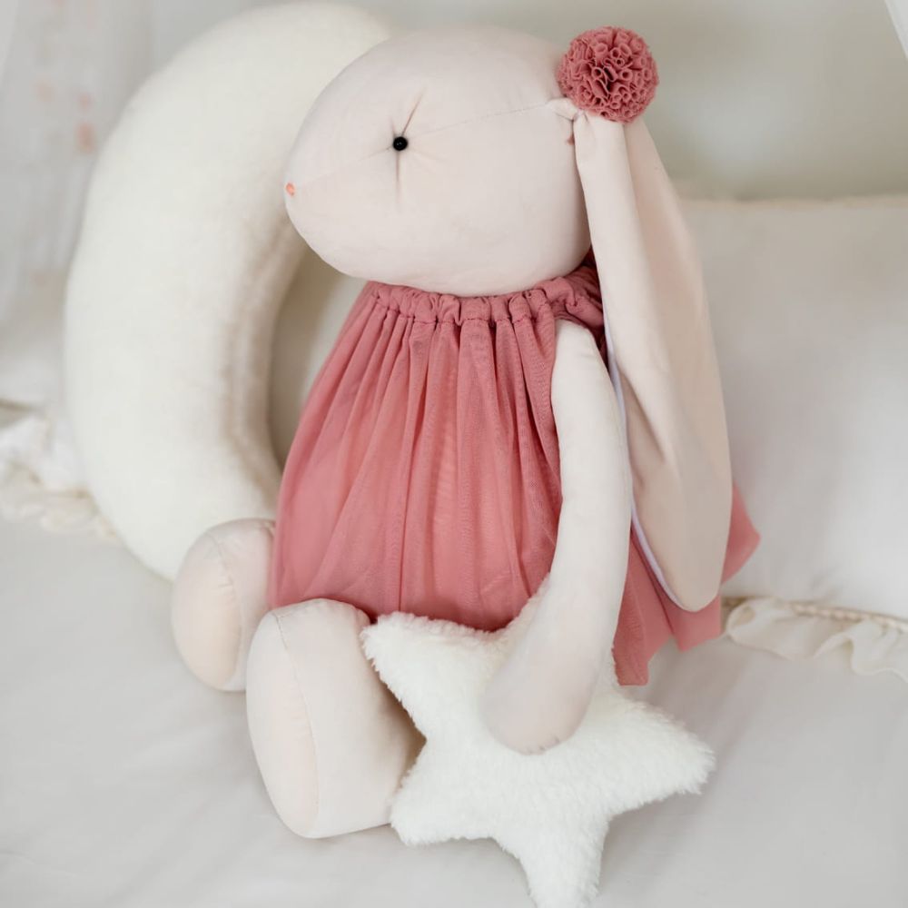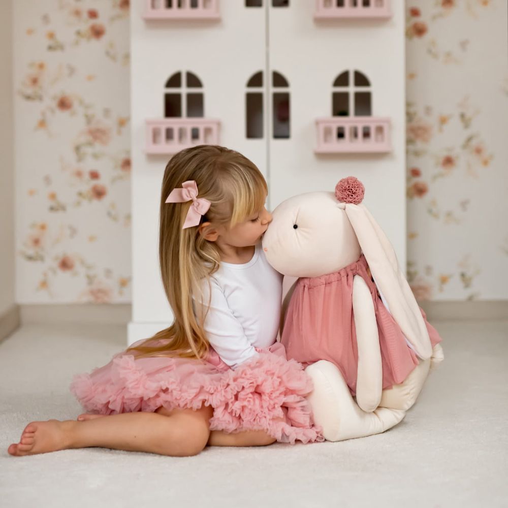Króliczka została wykonana z niezwykle przyjemnego w dotyku materiału, który zapewnia maksymalny komfort podczas przytulania. Jej wypełnienie jest lekkie i sprężyste, dzięki czemu idealnie dopasowuje się do dziecka.