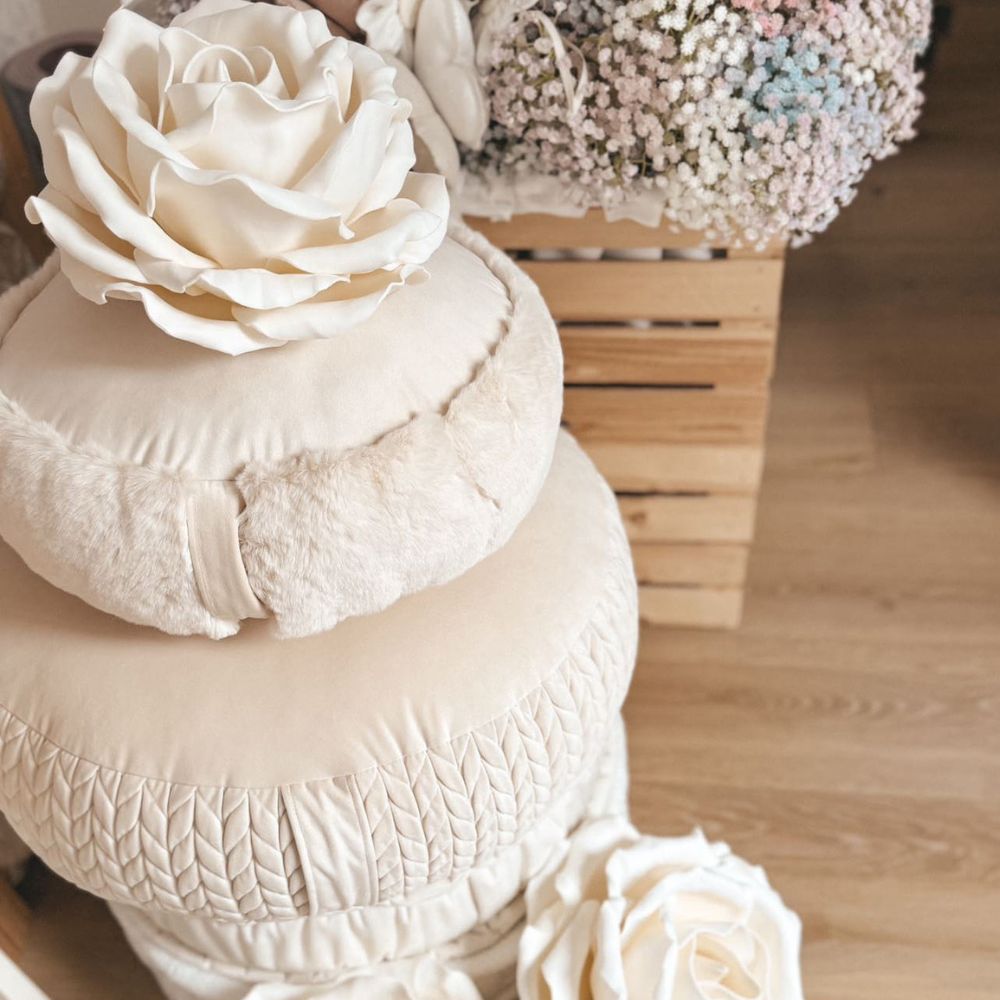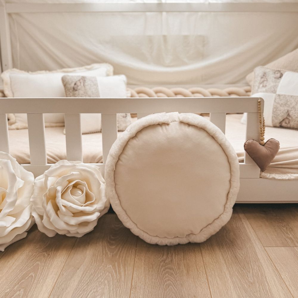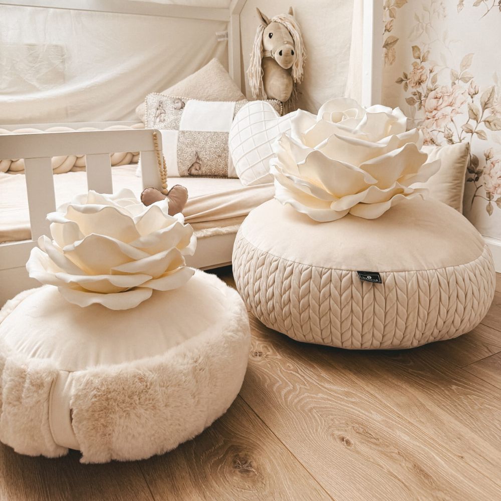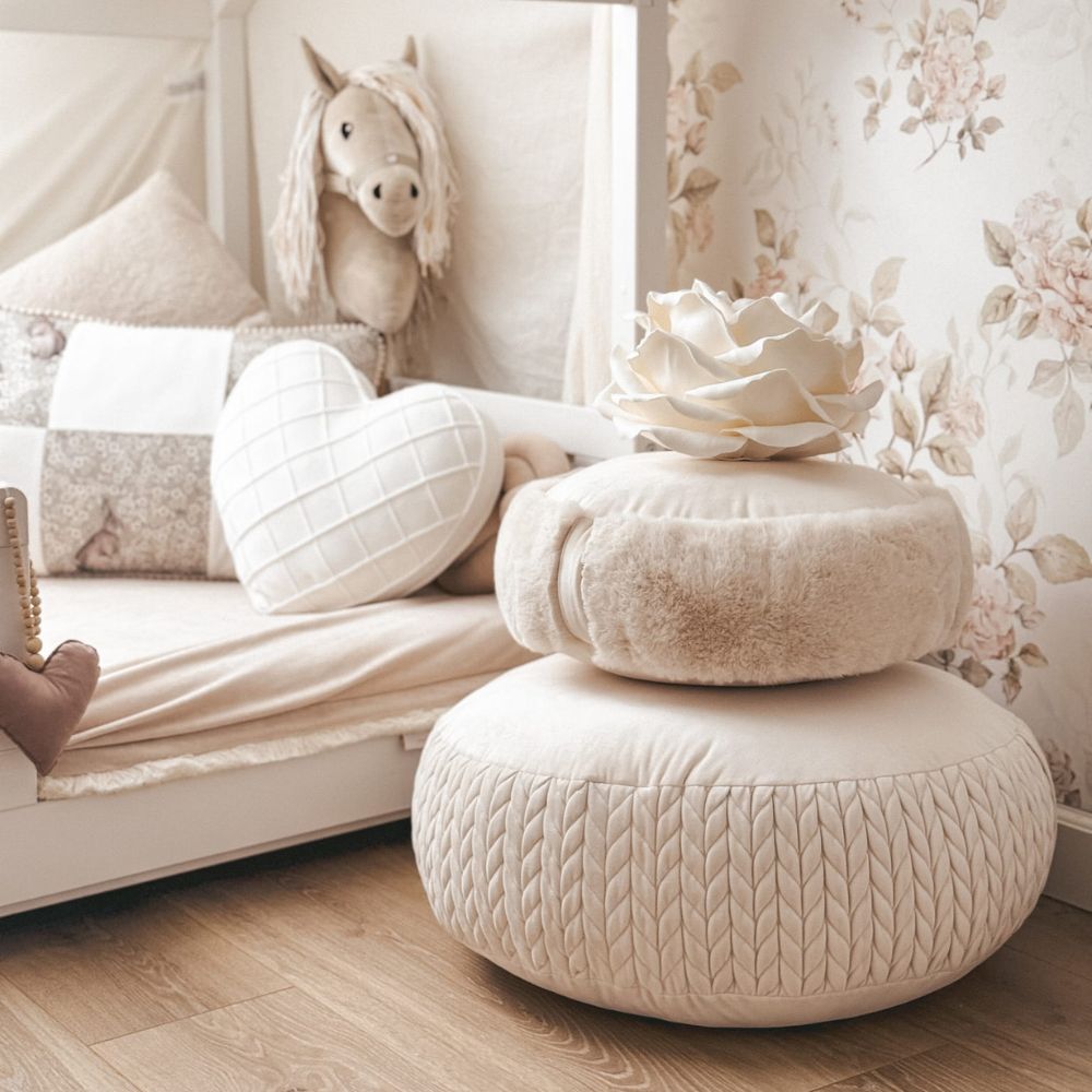 Dekoracyjna, okrągła pufa BUNNY to połączenie wyjątkowego komfortu, subtelnej elegancji i dziecięcej przytulności. Jej niski profil sprawia, że jest idealna nawet dla najmłodszych – świetnie sprawdzi się podczas zabawy na podłodze, odpoczynku czy jako wygodne siedzisko.