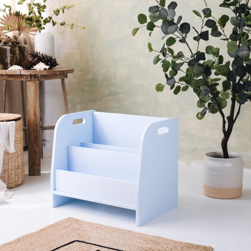 Biblioteczkę można zamówić w kilku opcjach kolorystycznych: białym, szarym, miętowym lub niebieskim. Do barwienia powierzchni zastosowano bezpieczne lakiery kolorowe.