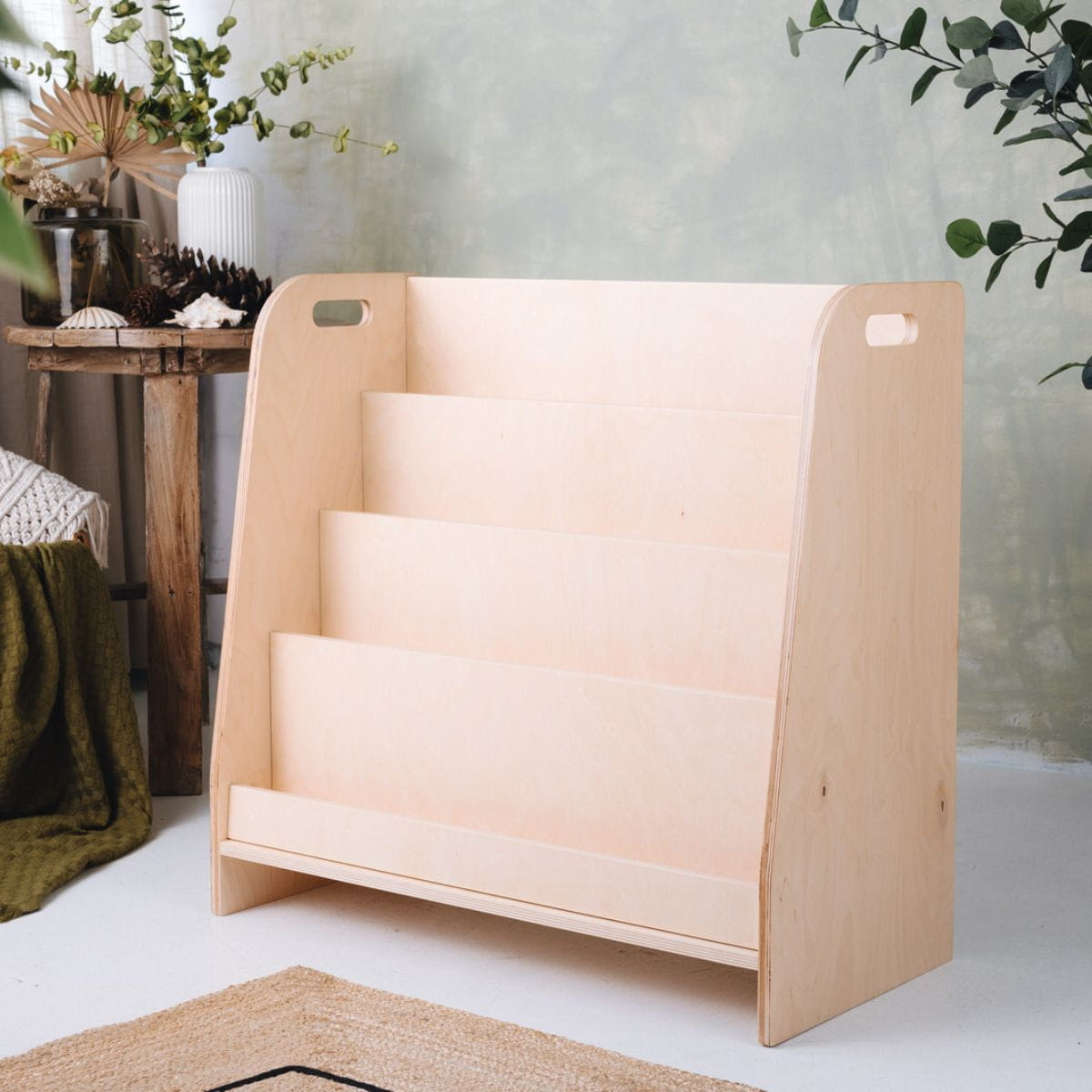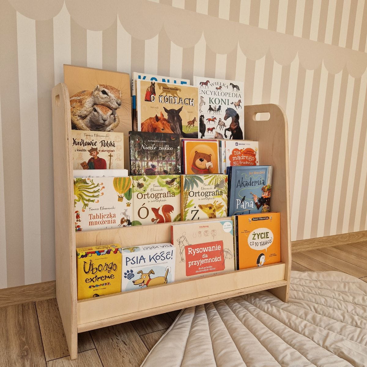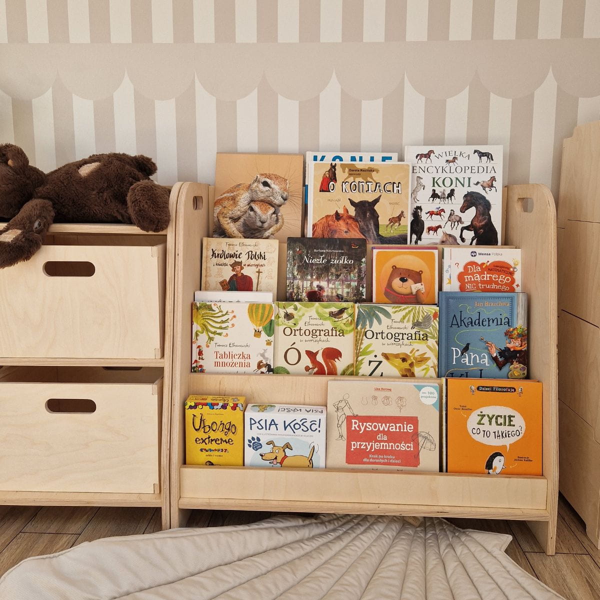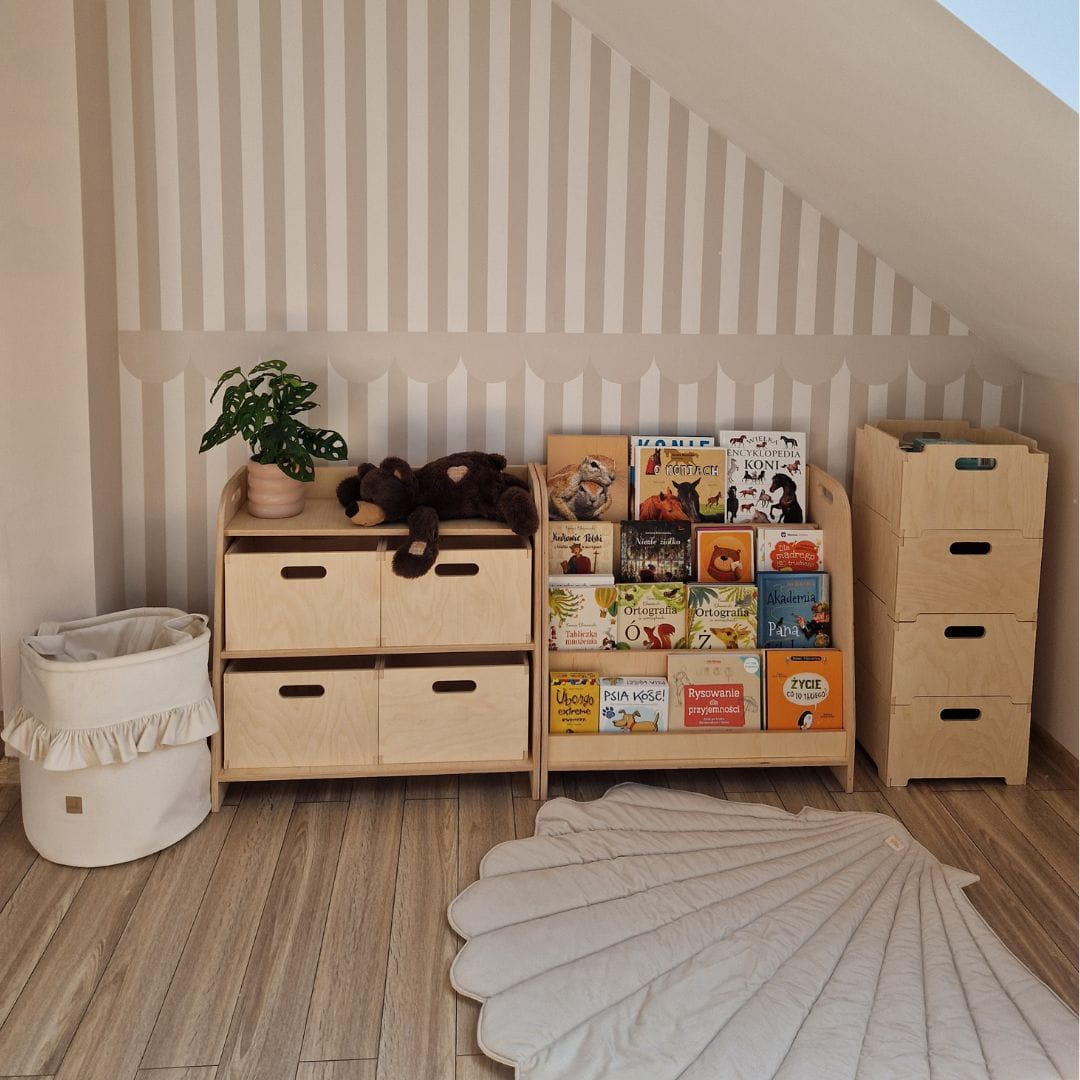 Minimalistyczny design biblioteczki doskonale wpisuje się w zasady pedagogiki Montessori – jest funkcjonalna, estetyczna i dostosowana do potrzeb dziecka. Nie zajmuje dużo miejsca (zaledwie 35 cm głębokości), a ustawienie bezpośrednio na podłodze sprawia, że maluch ma do niej swobodny dostęp.
