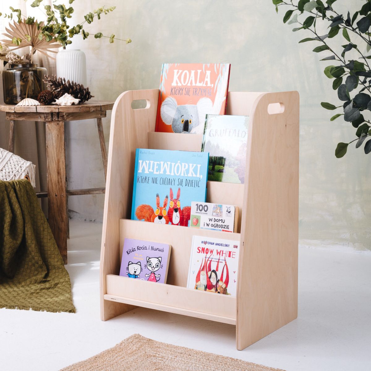 Minimalistyczny design biblioteczki doskonale wpisuje się w zasady pedagogiki Montessori – jest funkcjonalna, estetyczna i dostosowana do potrzeb dziecka. Nie zajmuje dużo miejsca (zaledwie 35 cm głębokości), a ustawienie bezpośrednio na podłodze sprawia, że maluch ma do niej swobodny dostęp.