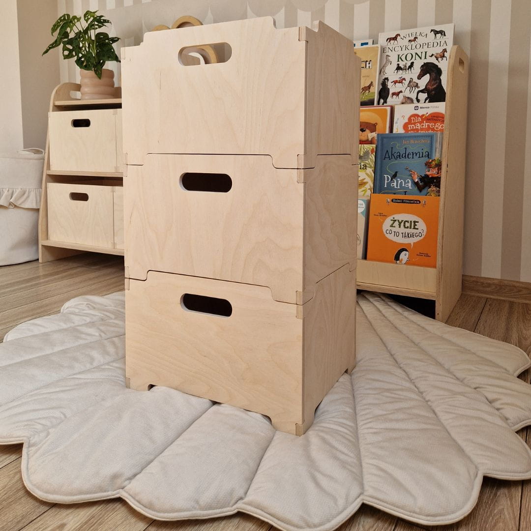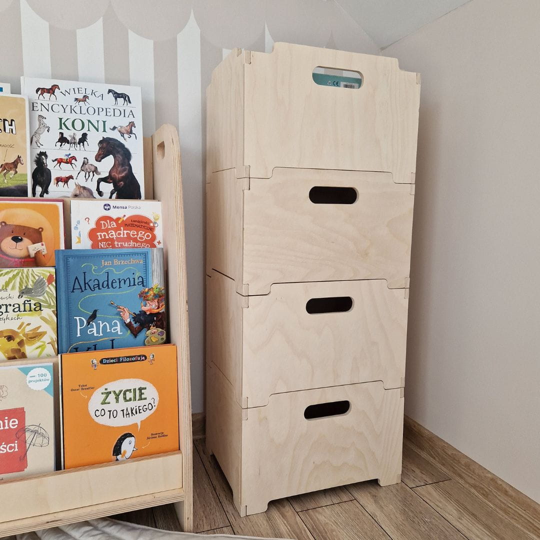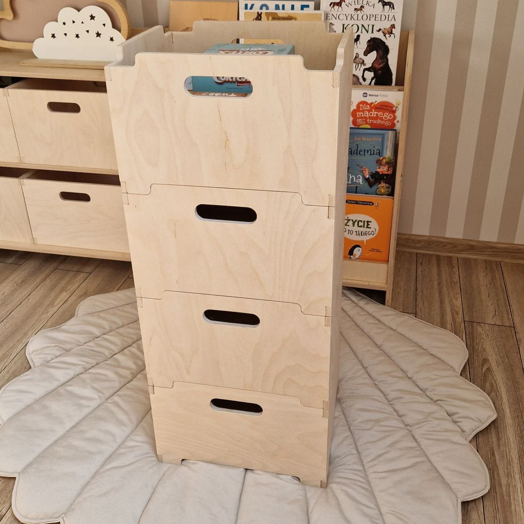 Skrzynki wykonane z wysokiej jakości sklejki są nie tylko trwałe, ale również estetyczne, co czyni je idealnym elementem dekoracyjnym w dziecięcej przestrzeni. Solidne i stabilne, skrzynki te mogą pomieścić różnorodne przedmioty - od zabawek i klocków, po książki, ubrania czy artykuły plastyczne.