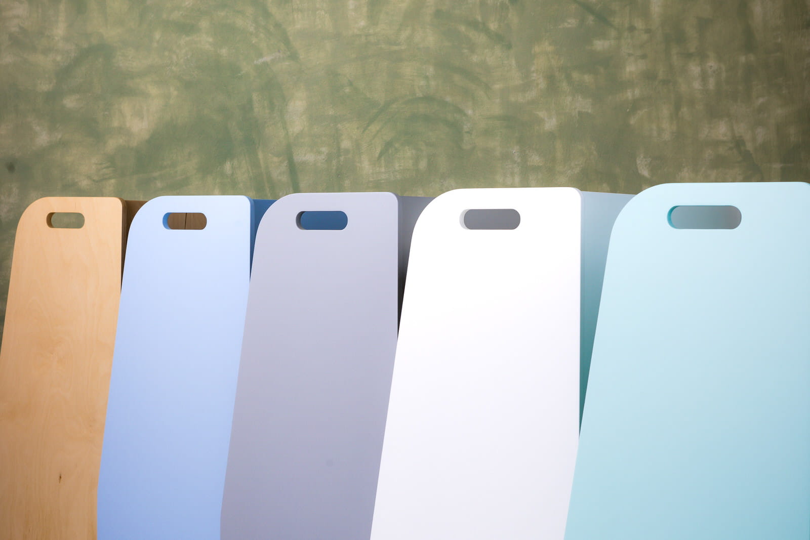 Regał można zamówić w kilku opcjach kolorystycznych: jedynie dokładnie oszlifowany - przygotowany do samodzielnego lakierowania, pokryty lakierem bezbarwnym lub farbami w kolorach: białym, szarym, miętowym lub niebieskim. Sklejkę, z której wykonane są regały zabezpieczamy atestowanymi lakierami wodnymi, a w przypadku barwienia powierzchni zastosowano bezpieczne lakiery kolorowe.