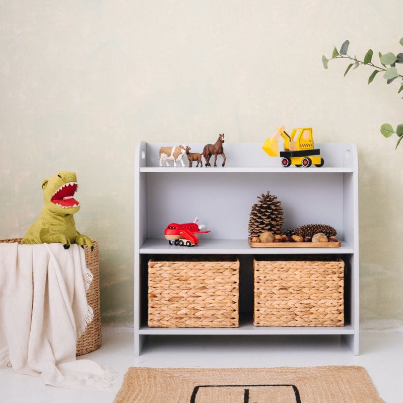 Regał na zabawki posiada trzy półki, do których dziecko ma nieograniczony dostęp. Mebel stoi bezpośrednio na podłodze i mierzy zaledwie 70cm wysokości.