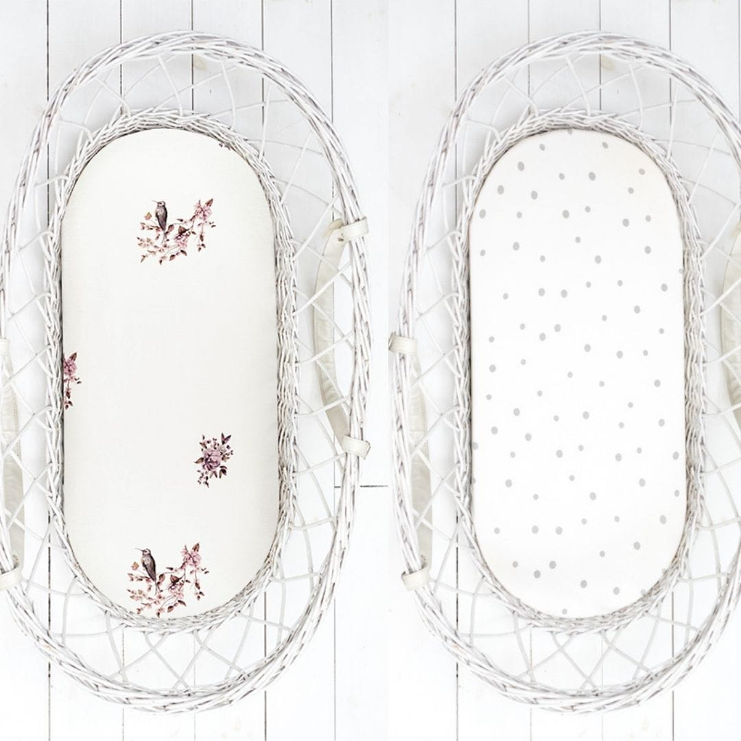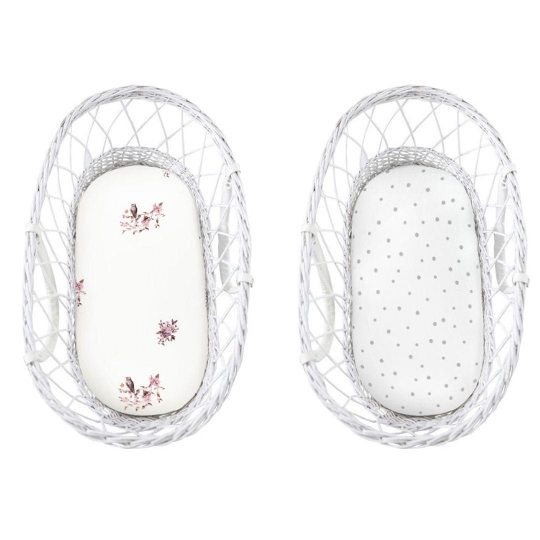 Zestaw składający się z dwóch prześcieradeł z gumką do gondoli, kosza mojżesza i kołysek dla dzieci.
