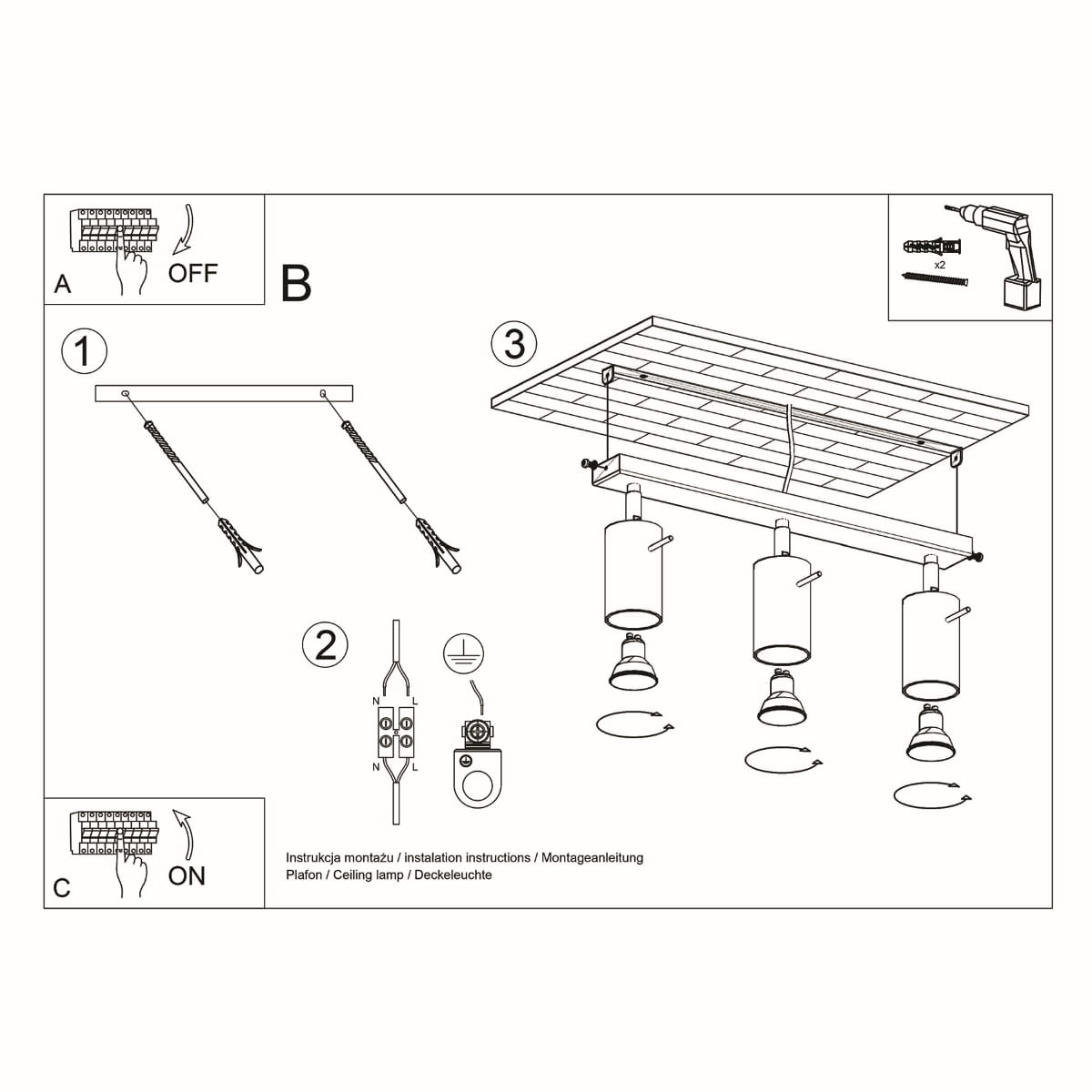 Źródło światła: GU10, 3x max 10W LED, ~230V, 50Hz, IP20, klasa ochronności I