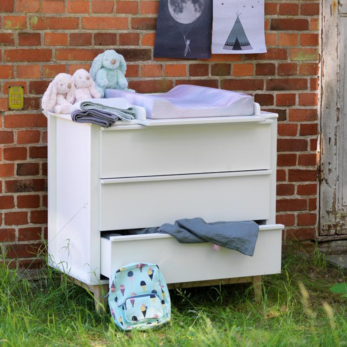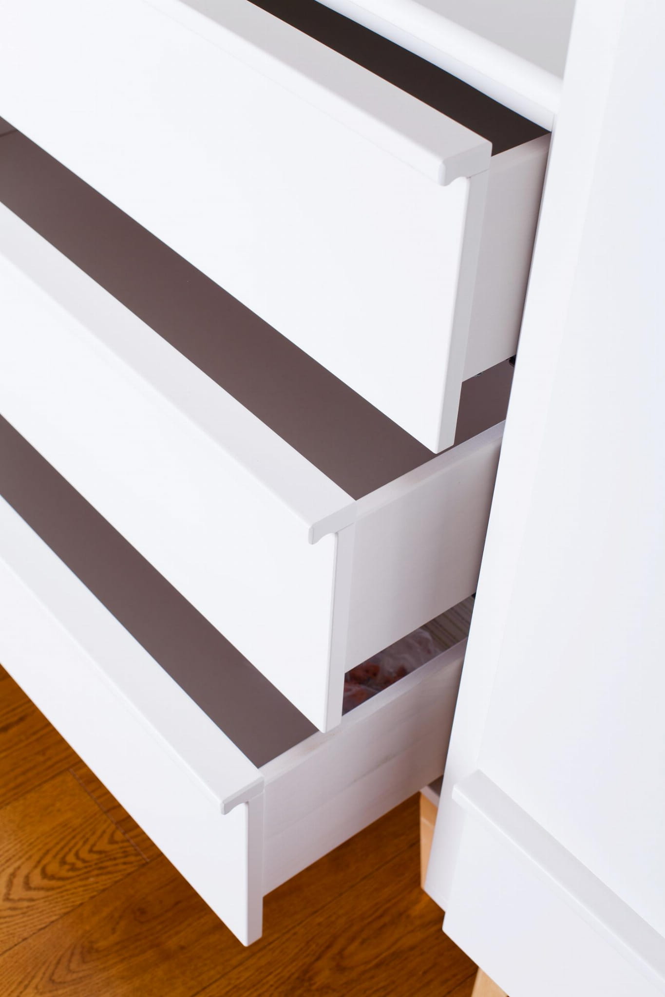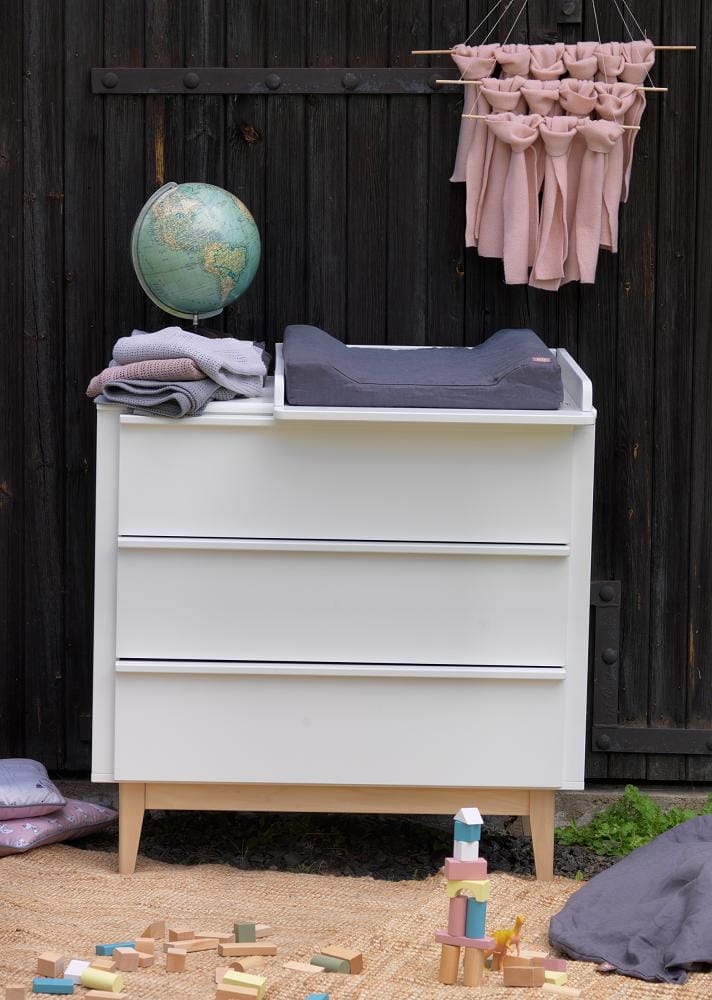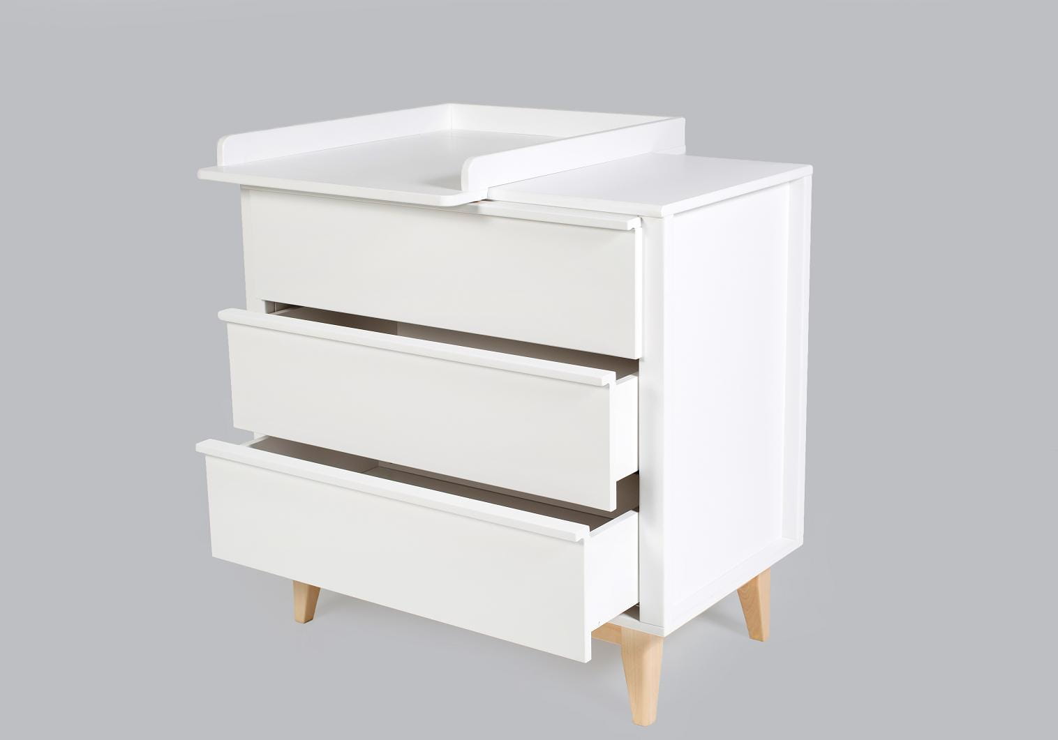 Wyposażona jest w trzy pojemne szuflady zamykane i otwierane dzięki cichym i niewidocznym prowadnicom z samodomykaczami oraz nakładany na blat komody funkcjonalny przewijak dla dziecka, który można umieścić z prawej lub lewej strony.