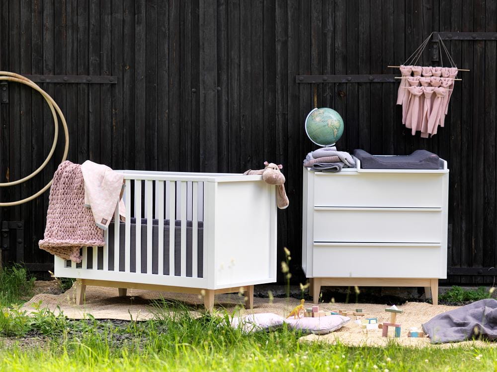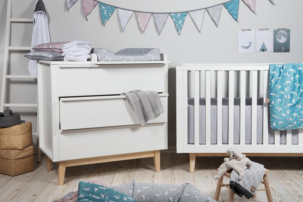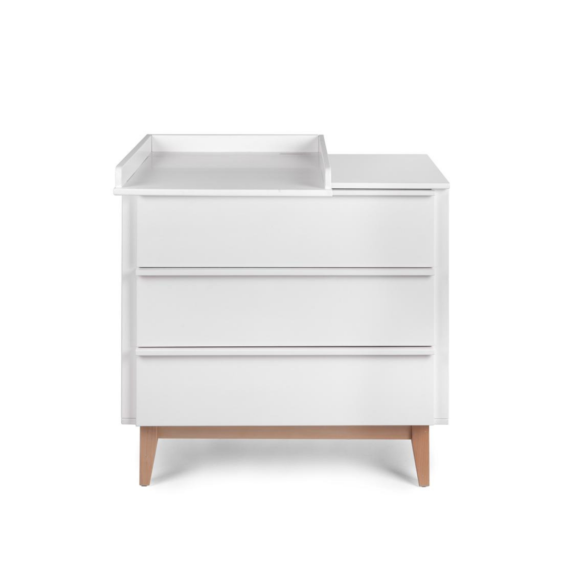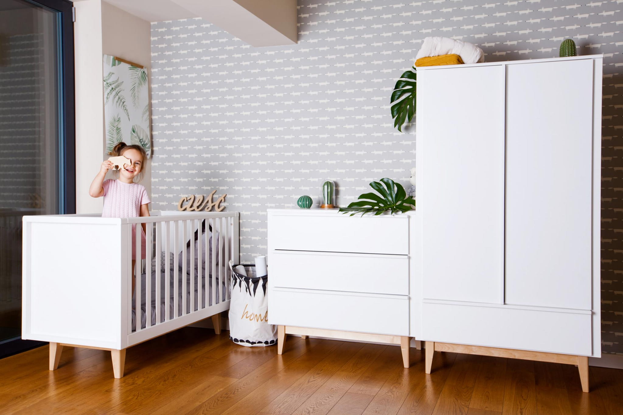 Wyposażona jest w trzy pojemne szuflady zamykane i otwierane dzięki cichym i niewidocznym prowadnicom z samodomykaczami oraz nakładany na blat komody funkcjonalny przewijak dla dziecka, który można umieścić z prawej lub lewej strony.