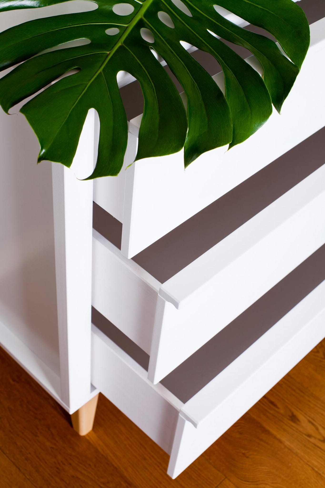 Komoda Scandy wykonana jest z litego drewna brzozowego, połączonego z wysokiej jakością płytą MDF. Biała, oryginalna bryła osadzona na delikatnych, drewnianych nóżkach to typowo skandynawska stylistyka.
