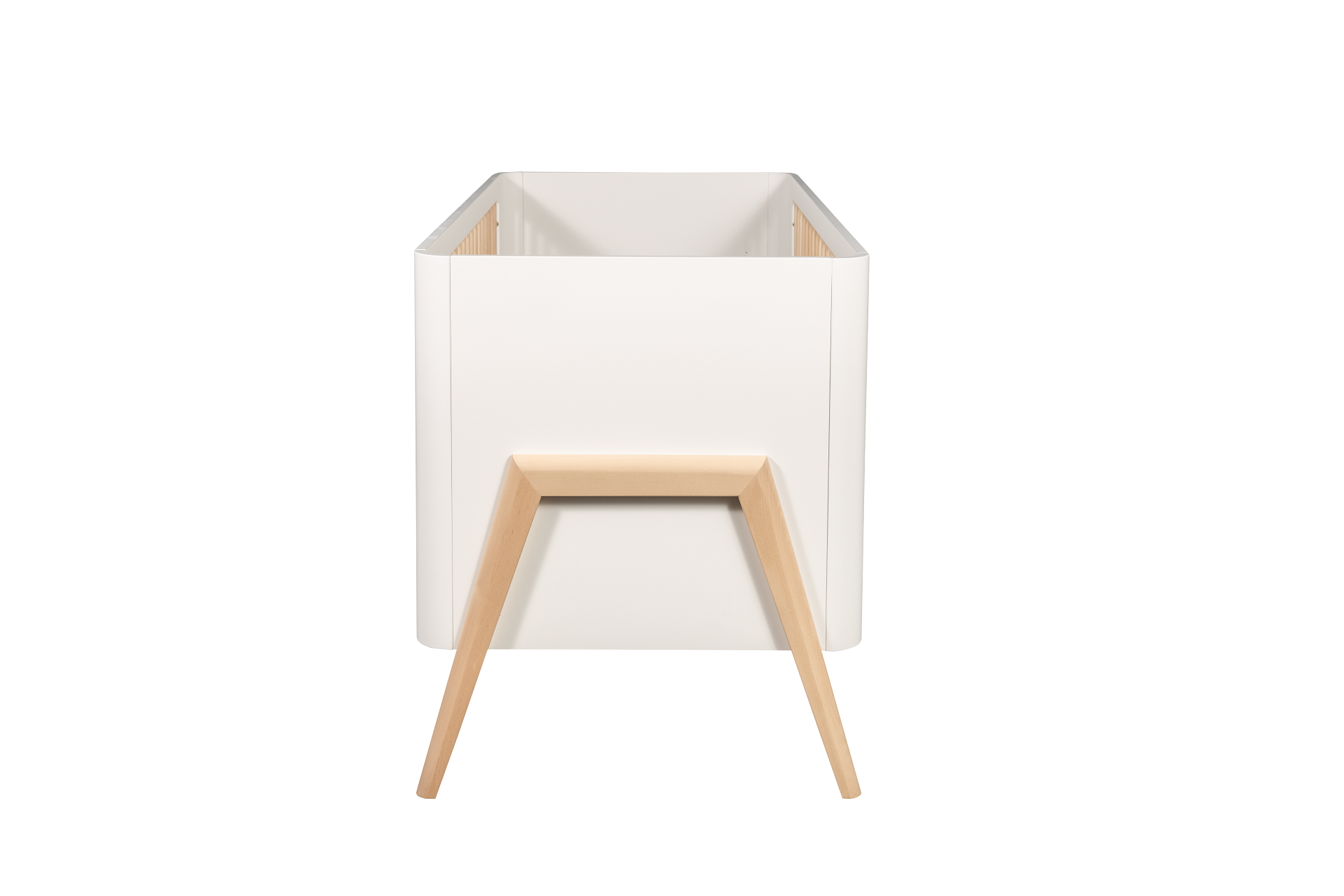 Łóżeczko dziecięce Torsten posiada zgrabny, zaokrąglony korpus osadzony na drewnianych nogach. Drewniane nóżki rozchodzące się na zewnątrz mebla dodają mu lekkości.