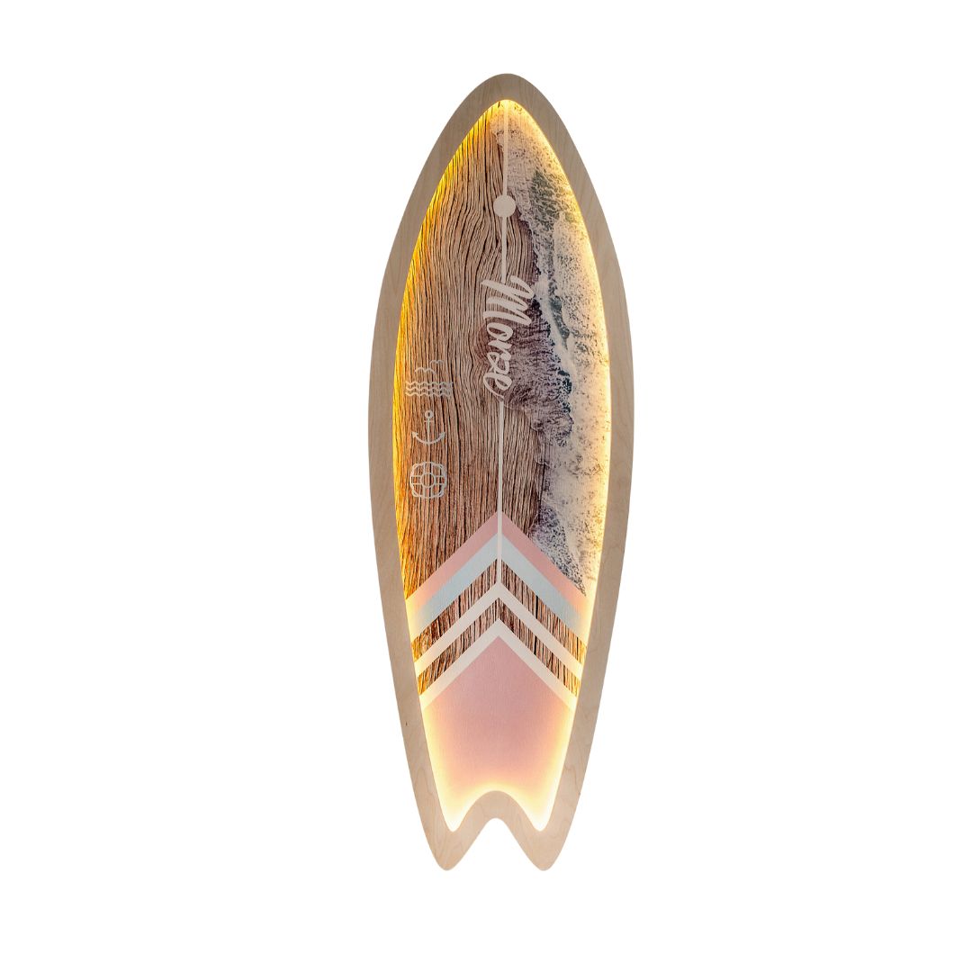 Takie lampki nocne stworzą wakacyjny klimat w pokoju dziecka lub nastolatka. Lampka deska surfingowa z napisem Morze, z falami i delikatnych odcieniach różu będzie pięknym uzupełnieniem morskich motywów.