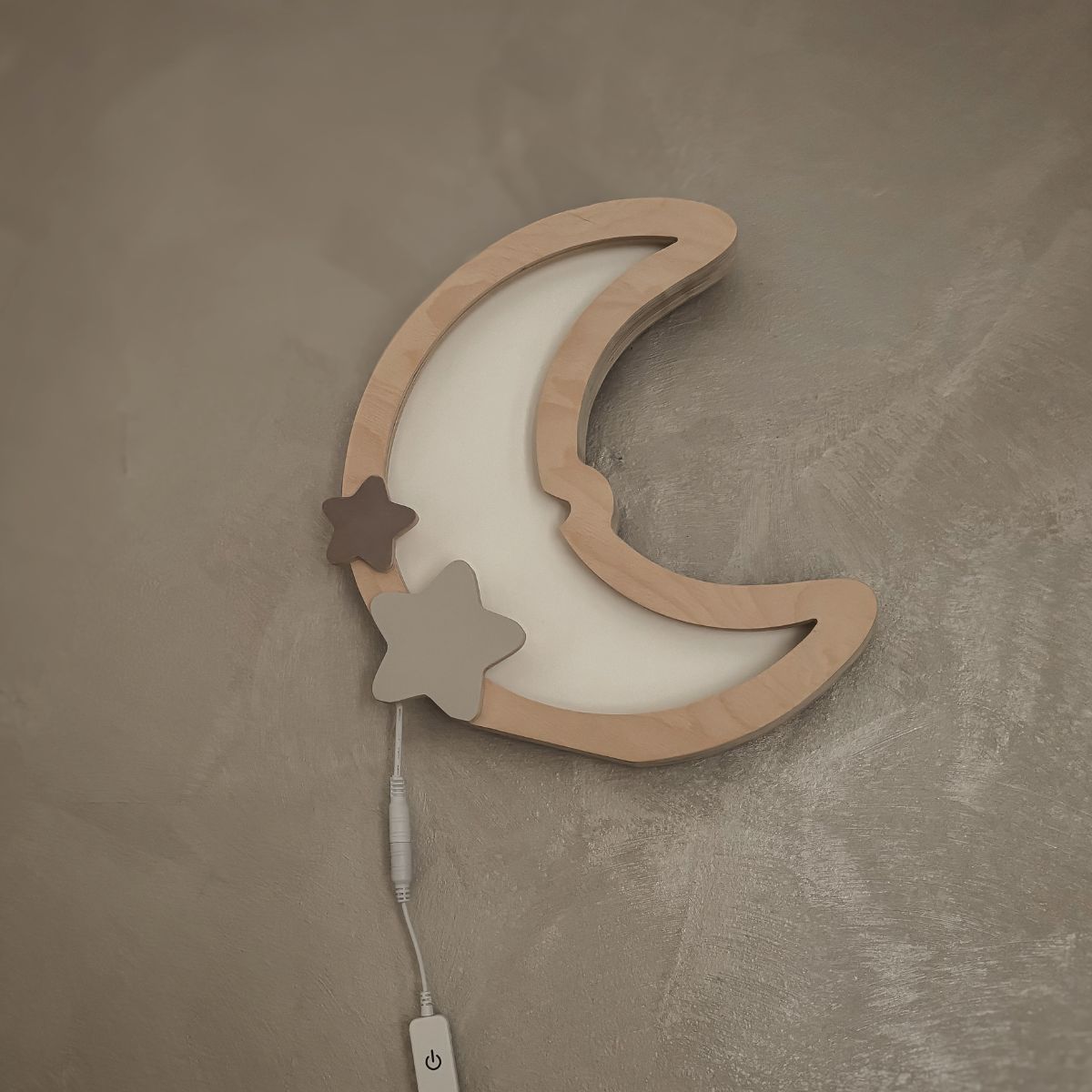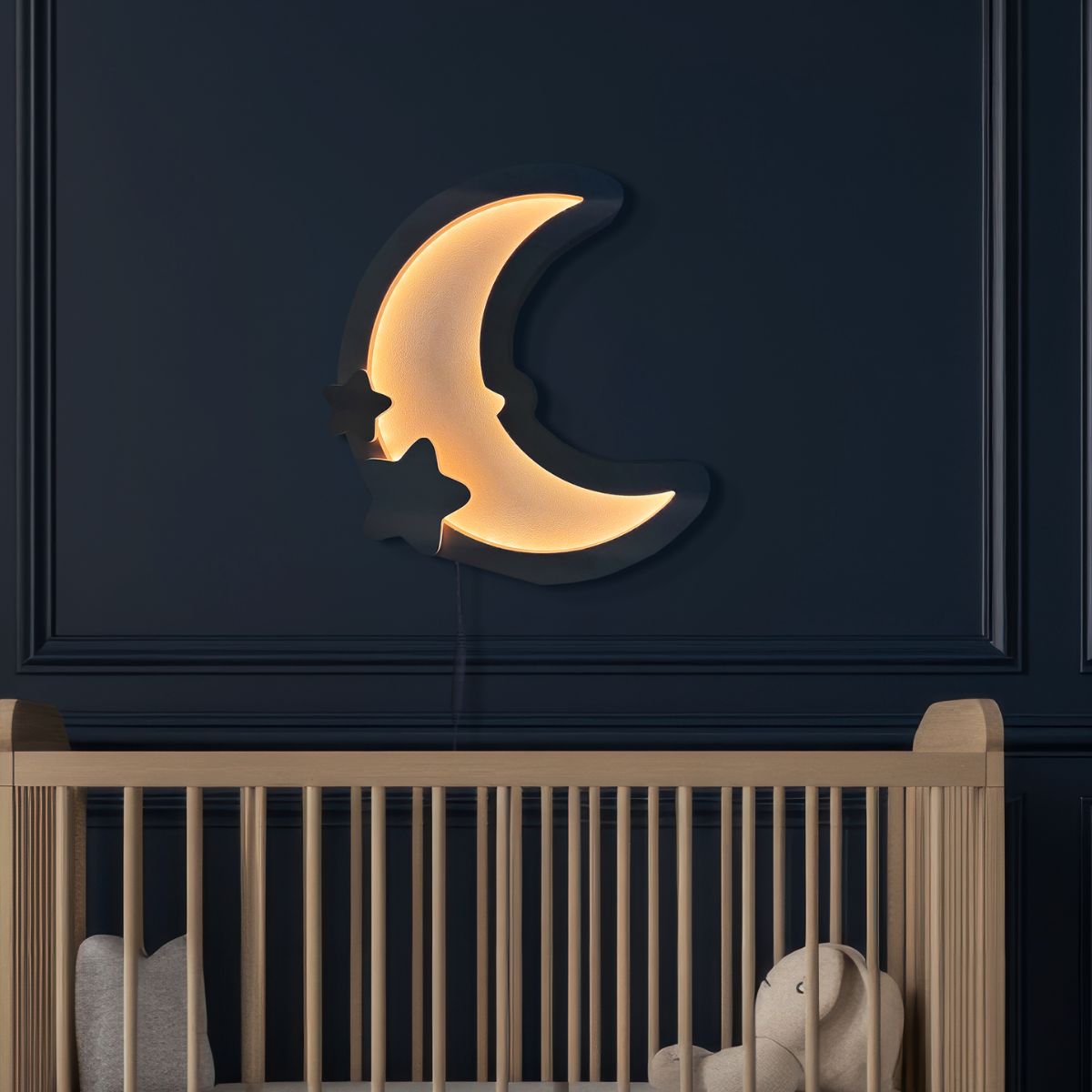 Lampka Księżyc może być zarówno zamontowana na ścianie, jak i ustawiona na szafce nocnej – dzięki dołączonej podstawce. To uniwersalne rozwiązanie, które sprawdzi się w każdym dziecięcym wnętrzu – od pokoju niemowlaka po pokój przedszkolaka.