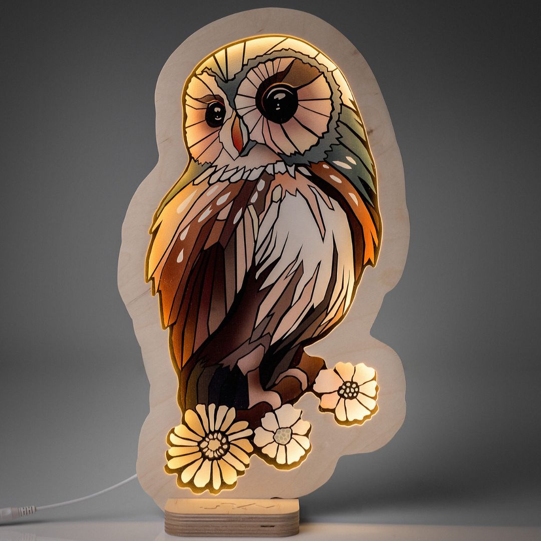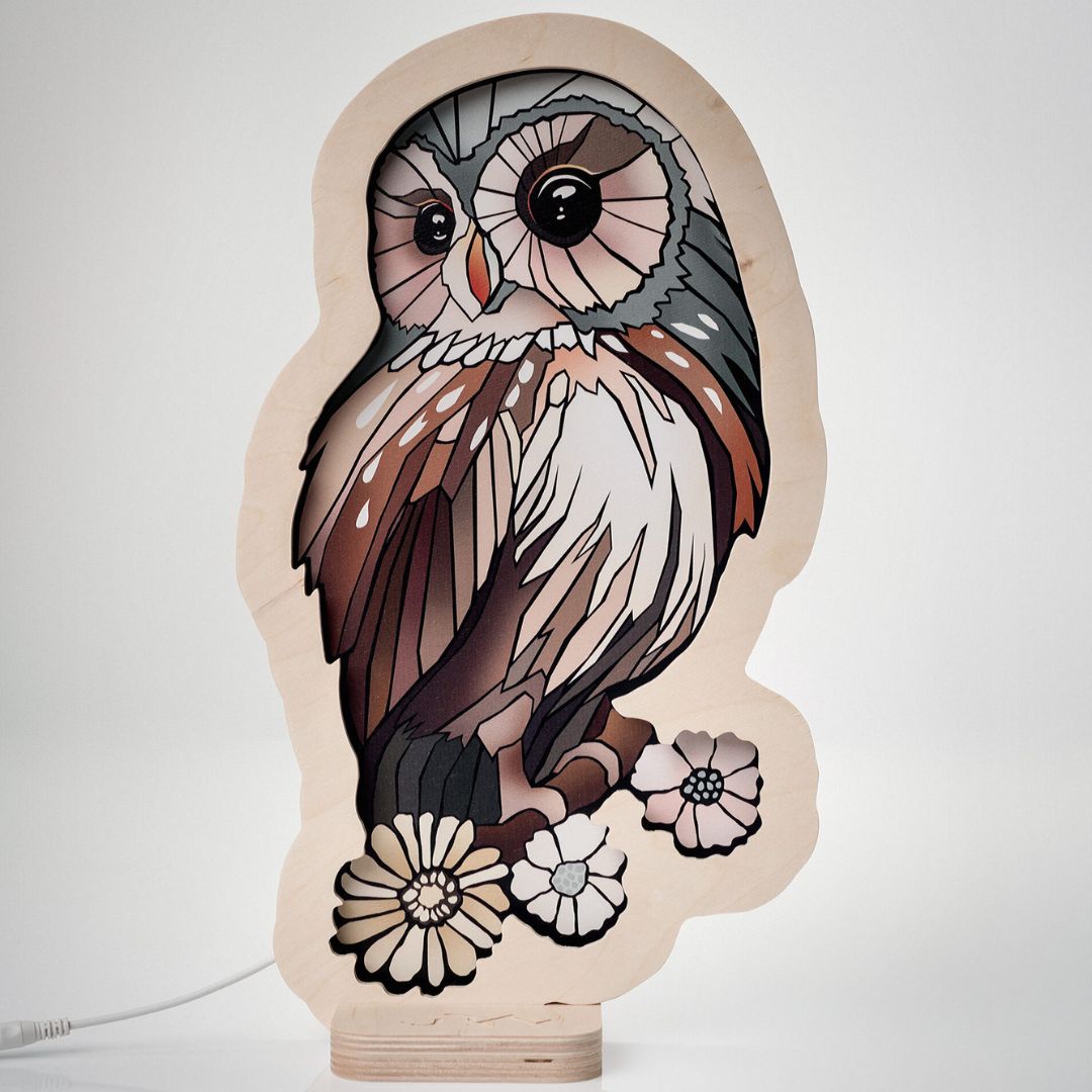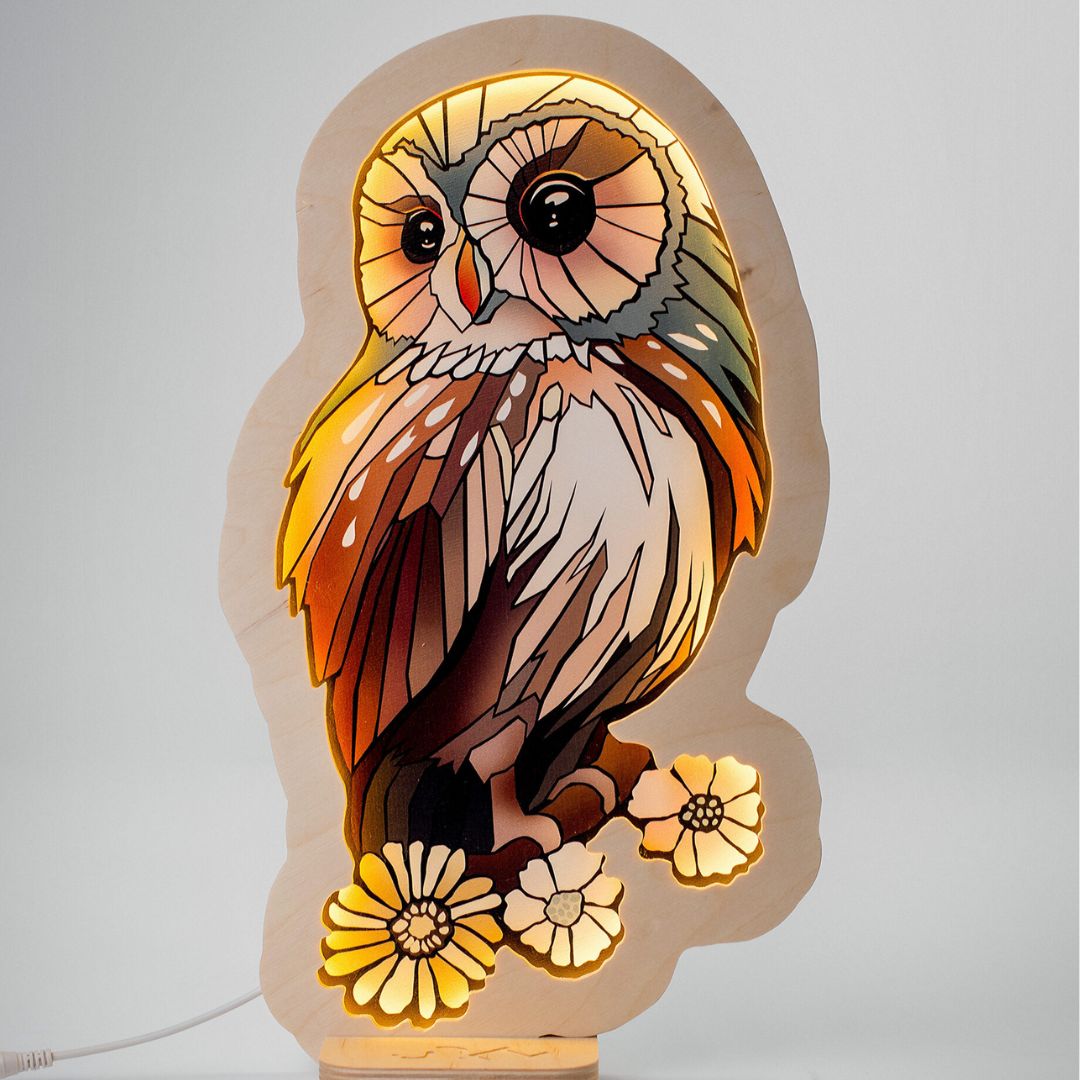 Dodaj odrobinę magii do pokoju swojego dziecka z wyjątkową lampką nocną w kształcie sowy. Wykonana z wysokiej jakości sklejki, ta stylowa dekoracja doskonale wpasuje się w każde wnętrze, tworząc przytulną i ciepłą atmosferę. Pięknie zaprojektowana sowa o delikatnych kolorach i kwiatowych akcentach to idealna ozdoba pokoju dziecka.