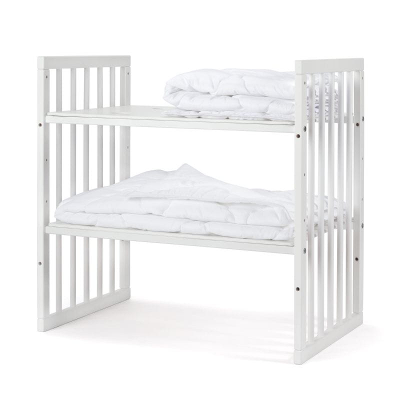 Mebelek może być wykorzystywany także jako małe łóżeczko. Najważniejsze zalety tej konfiguracji to kompaktowe wymiary i mobilność. Przymocowane do podstawy łóżeczka gumowane kółka pozwalają na jego przesuwanie, zostały wyposażone w blokadę. Z reszty drewnianych elementów stworzycie funkcjonalny przewijak z dodatkową półką, który ułatwi codzienną pielęgnację malucha.