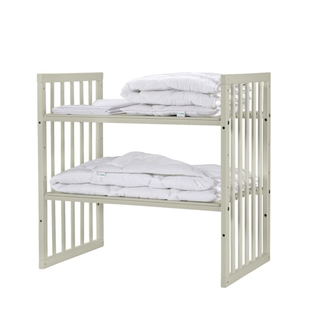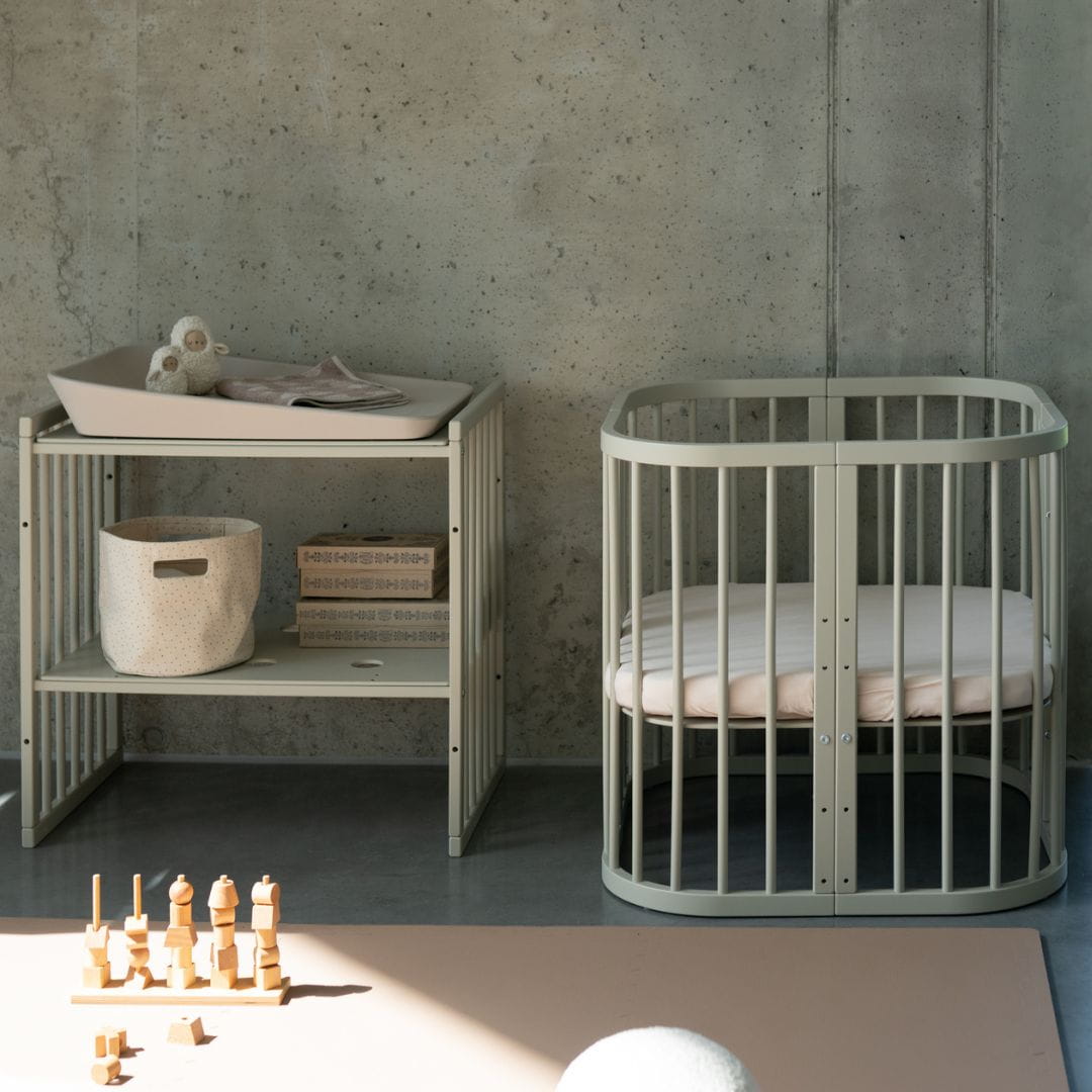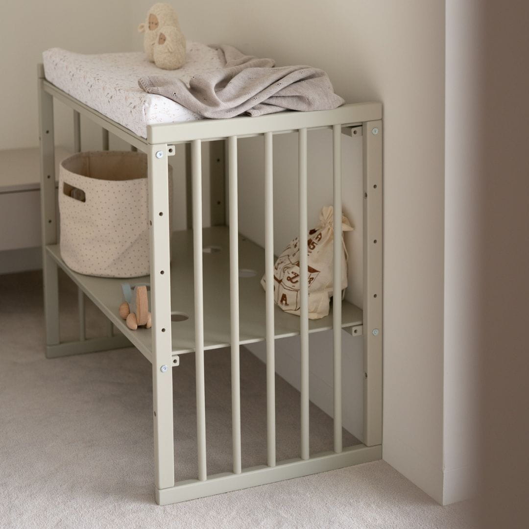 Mebelek może być wykorzystywany także jako małe łóżeczko. Najważniejsze zalety tej konfiguracji to kompaktowe wymiary i mobilność. Przymocowane do podstawy łóżeczka gumowane kółka pozwalają na jego przesuwanie, zostały wyposażone w blokadę. Z reszty drewnianych elementów stworzycie funkcjonalny przewijak z dodatkową półką, który ułatwi codzienną pielęgnację malucha.