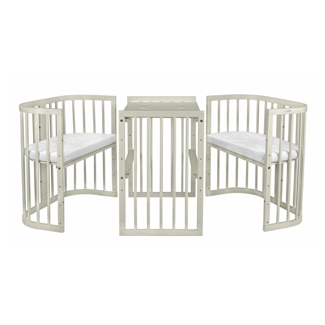 Nie musisz rezygnować z naszego mebelka, kiedy dziecko będzie starsze. Może pełnić funkcję zestawu – stolik i 2 krzesełka. Wystarczy, że wrócicie do konfiguracji dwóch dostawek i przewijaka. Po dostosowaniu wysokości blatu i siedziska maluch zyska elegancki i komfortowy kącik do zabawy, idealny dla przedszkolaka.