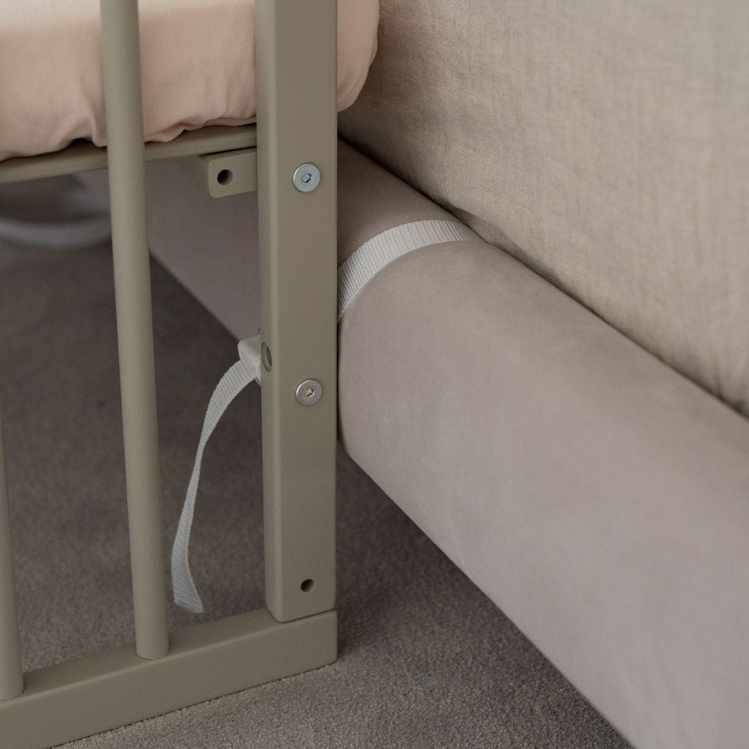 W komplecie jest specjalny pas – służy do zabezpieczenia dostawki, aby się nie przesuwała. 5-metrowy pas, którym oplatamy łóżko rodzica sprawia, że łóżeczko jest bezpieczne i stabilne.