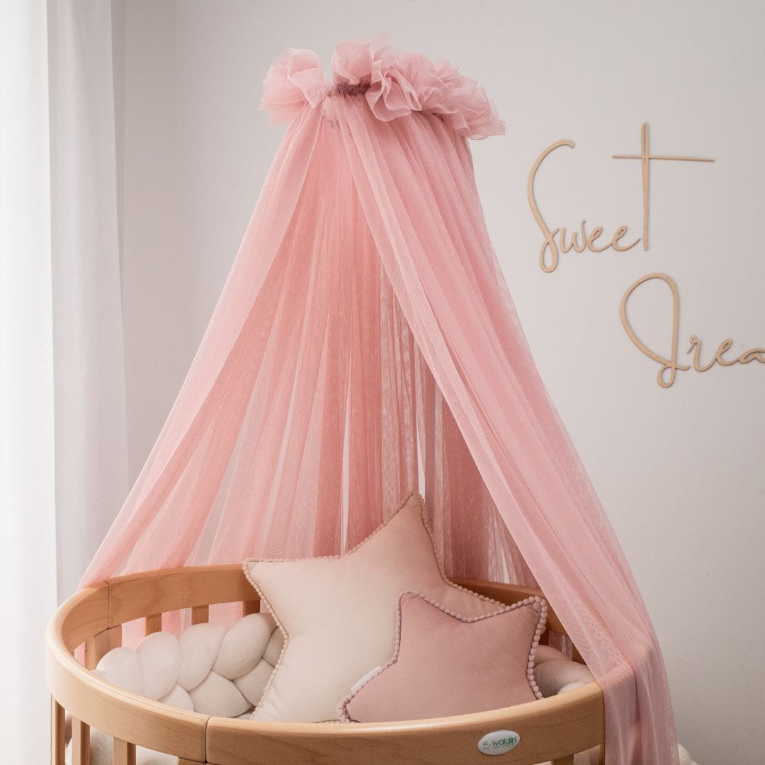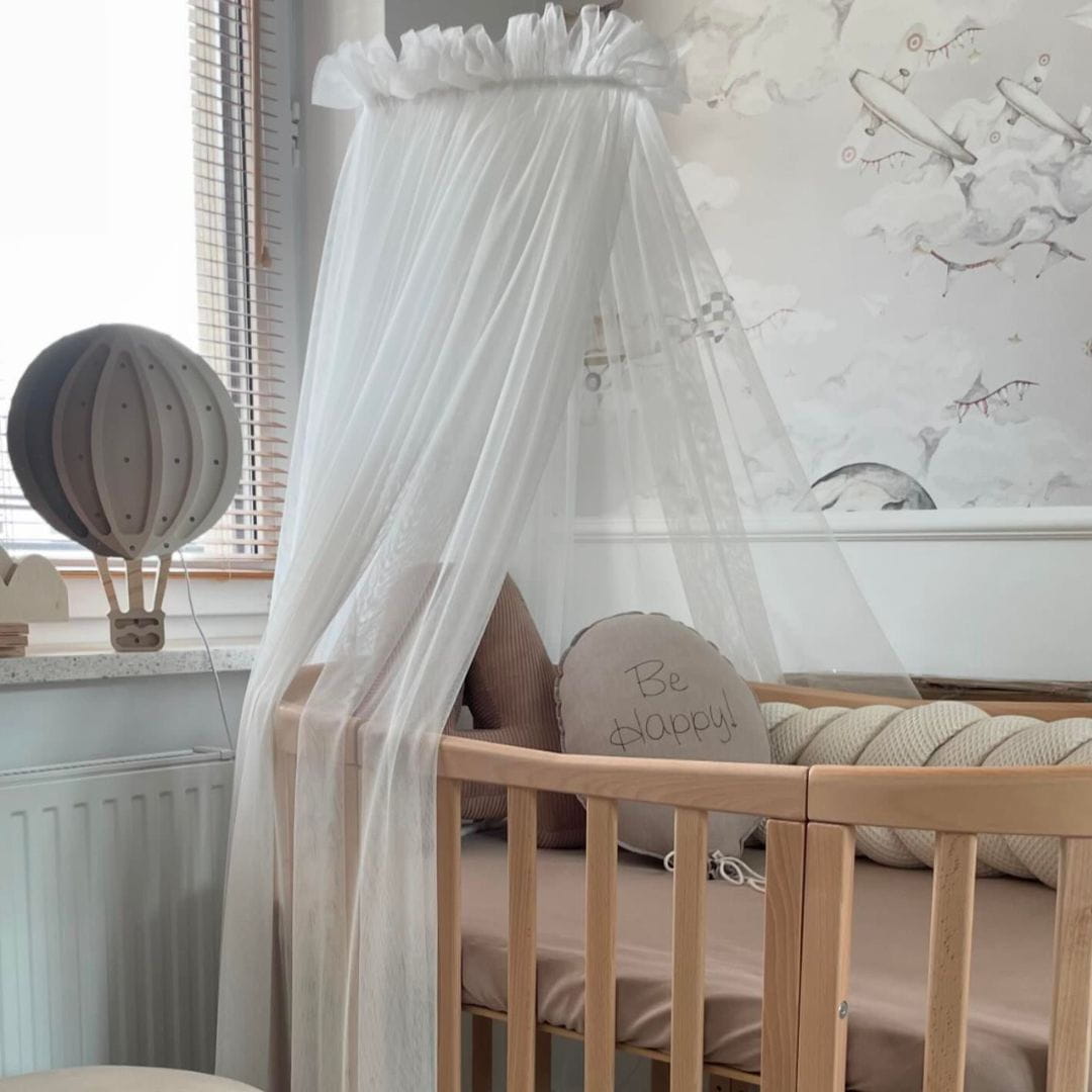 Ciekawą ozdobą będzie baldachim tiulowy, który w zestawie zawiera odpowiednią podporę - nie musisz się martwić o to jak zamontować baldachim nad łóżeczkiem. Do wyboru jest kilka kolorów z miękkiego tiulu (45 g/m2). Baldachim ma rozmiar 700 x 155 cm.