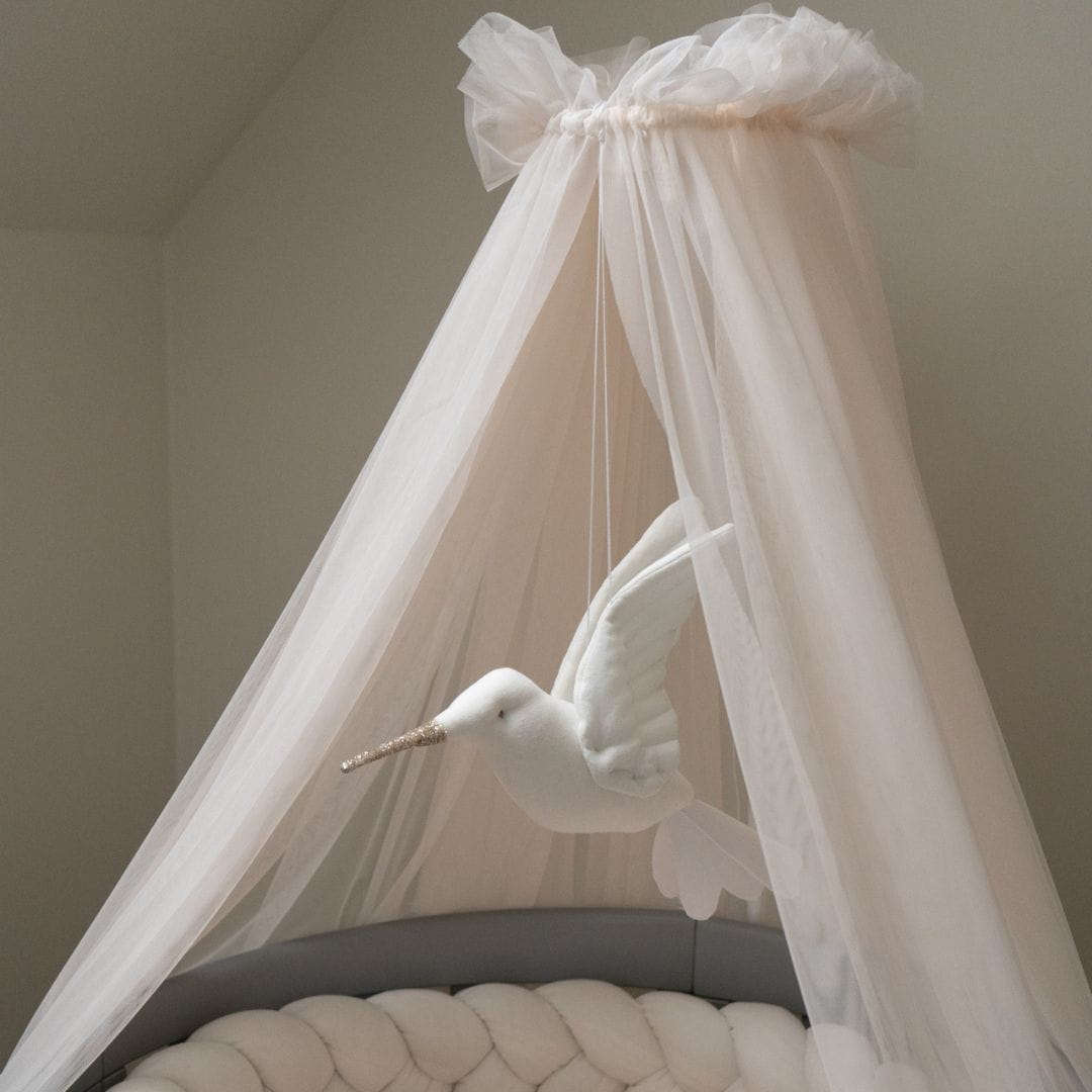 Ciekawą ozdobą będzie baldachim tiulowy, który w zestawie zawiera odpowiednią podporę - nie musisz się martwić o to jak zamontować baldachim nad łóżeczkiem. Do wyboru jest kilka kolorów z miękkiego tiulu (45 g/m2). Baldachim ma rozmiar 700 x 155 cm.