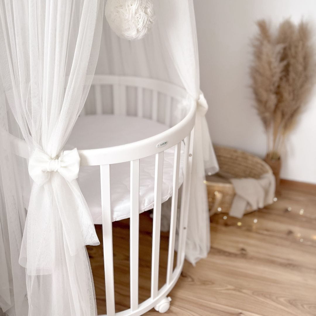 Ciekawą ozdobą będzie baldachim tiulowy, który w zestawie zawiera odpowiednią podporę - nie musisz się martwić o to jak zamontować baldachim nad łóżeczkiem. Do wyboru jest kilka kolorów z miękkiego tiulu (45 g/m2). Baldachim ma rozmiar 700 x 155 cm.