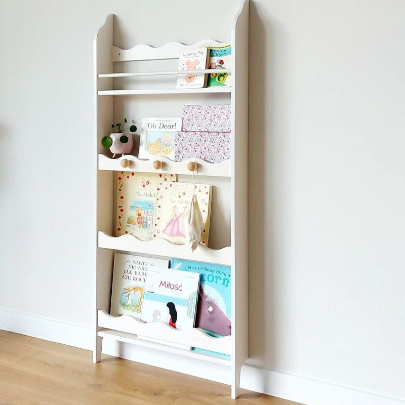 Stojąca drewniana półka falbanka to regał na książki i nie tylko. Z pewnością pomieści wiele dziecięcych skarbów. Stojące półeczki polskiej marki Wamm Cosy Room są dopasowane do wzrostu i potrzeb maluchów. Dzięki przemyślanemu rozstawieniu przegródek dzieci z większą łatwością i chęcią sięgają po książki. Specjalna konstrukcja biblioteczki dla dzieci pozwala na ekspozycję książek frontami, tak aby dziecko widziało, po którą pozycję chce sięgnąć.