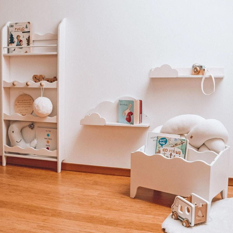 Biała biblioteczka dziecięca z falbanką - urocza półeczka do pokoju dziecięcego