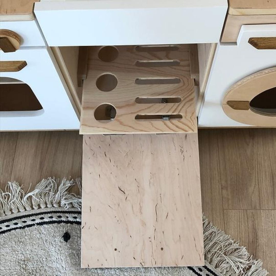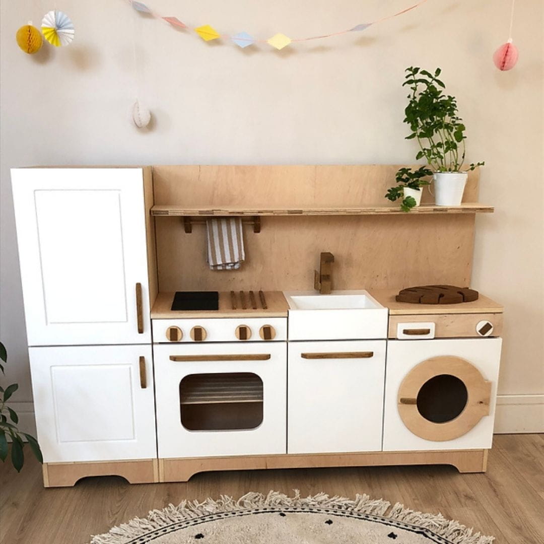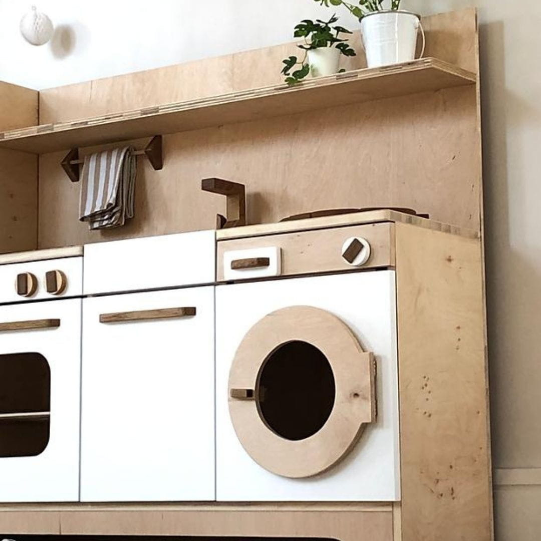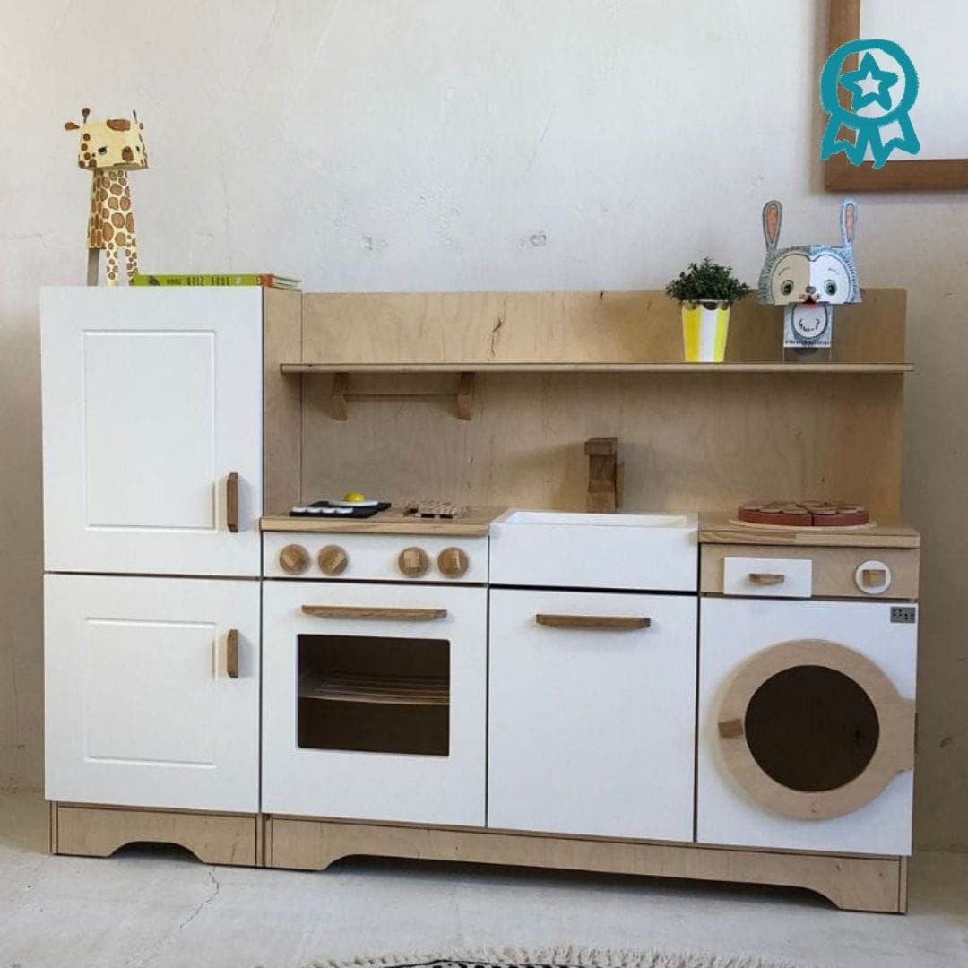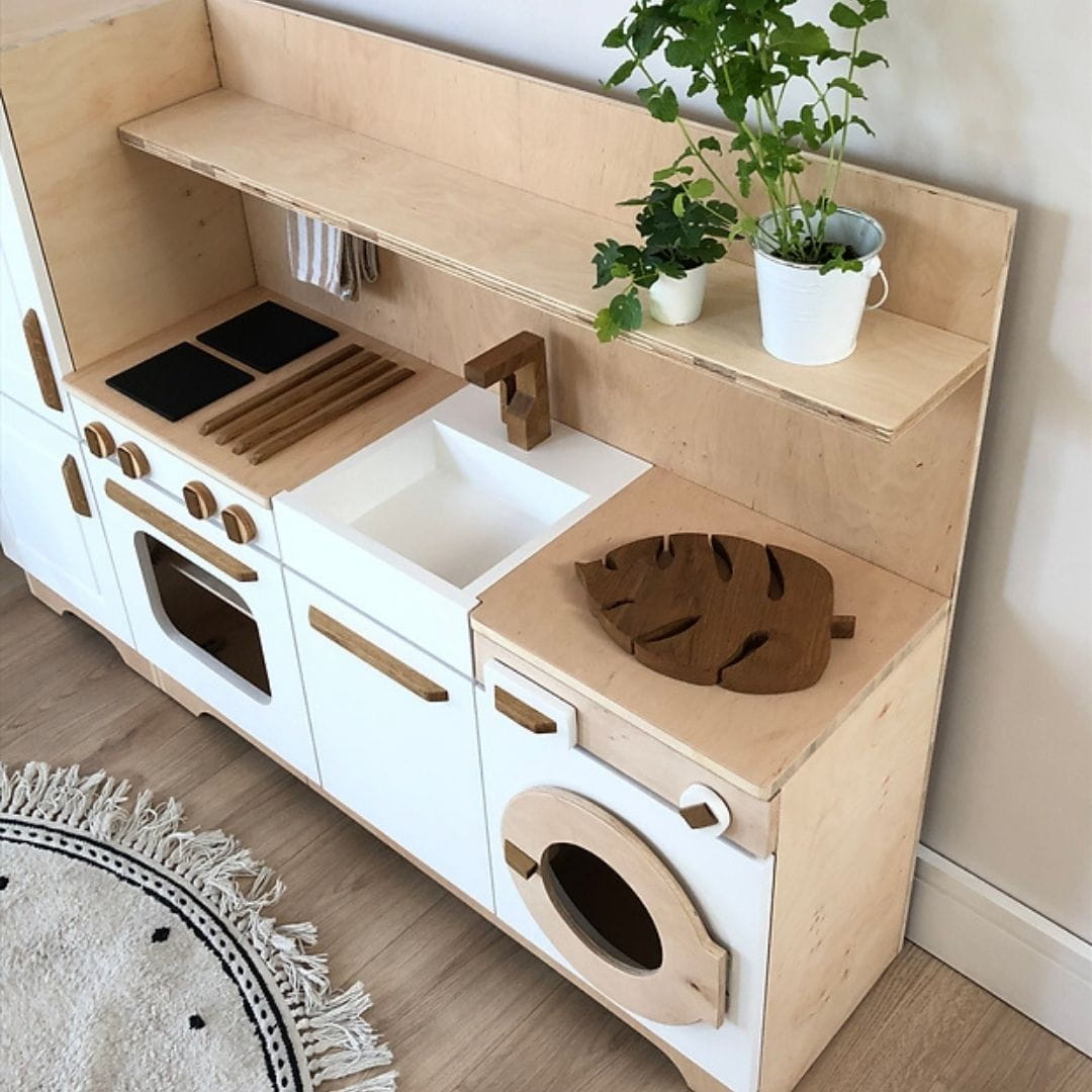 Drewniana mini kuchnia dla dzieci wyposażona w najbardziej niezbędne sprzęty każdej strefy kuchennej: lodówkę, piekarnik, zmywarkę, a nawet pralkę. We wnętrzach znajdują się także wysuwane półki i akcesoria. Dodatkowo na kuchennym blacie umieszczone są dwa palniki z ruchomymi pokrętłami, zlew oraz kran.