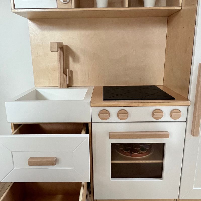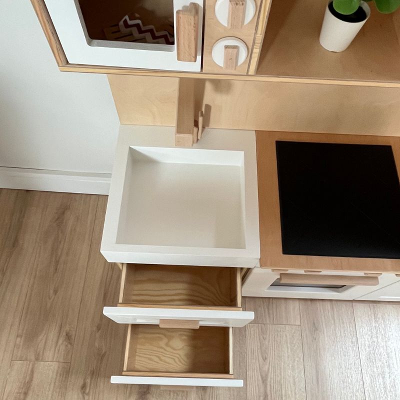 Wszystkie krawędzie zostały starannie oszlifowane, a do wykończenia użyto bezpiecznych, certyfikowanych farb i lakierów, przeznaczonych do produktów dziecięcych. Dzięki temu kuchnia jest w pełni bezpieczna nawet dla najmłodszych użytkowników.
