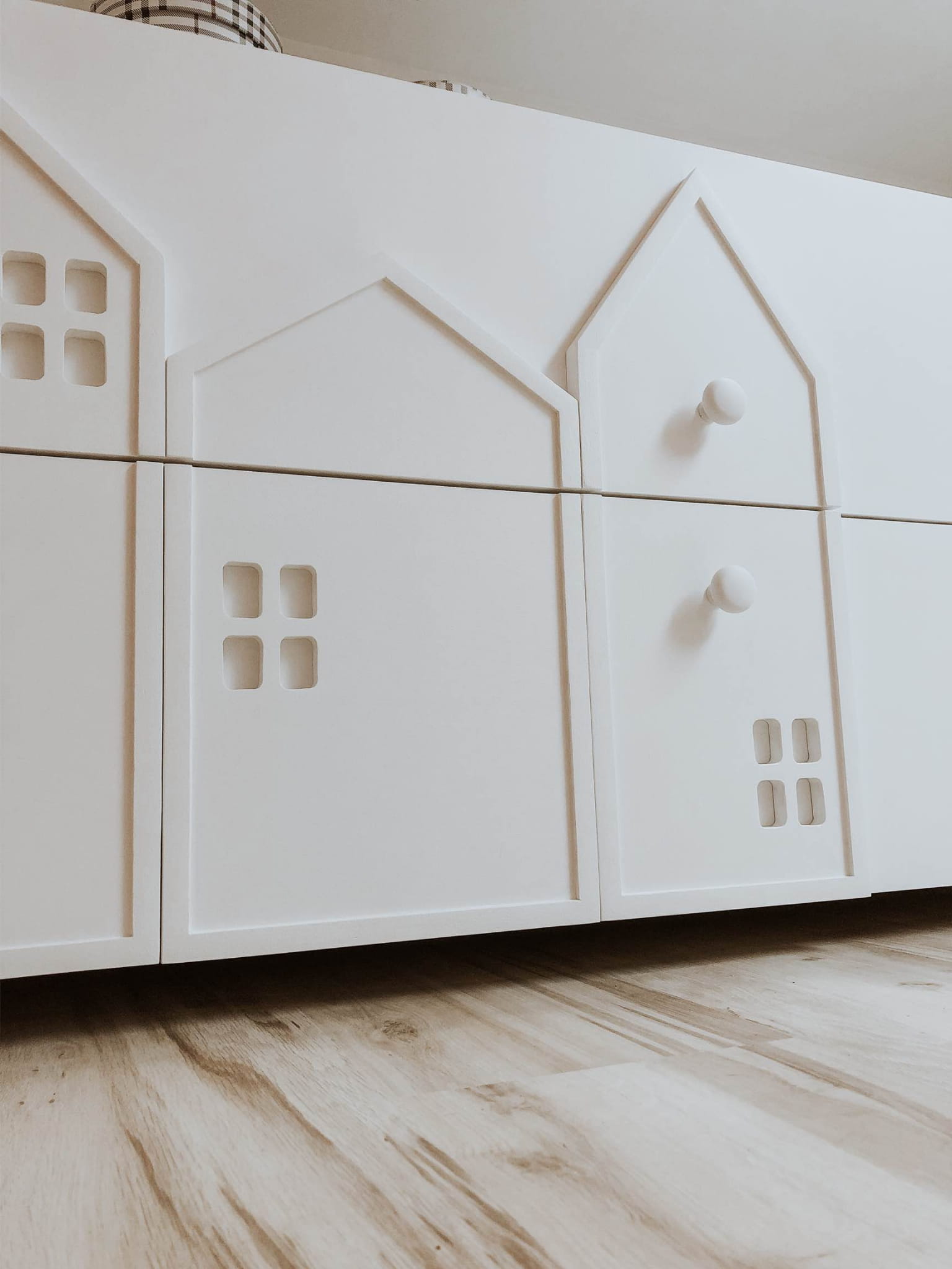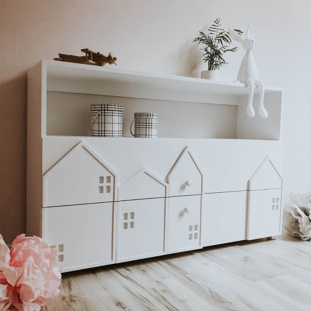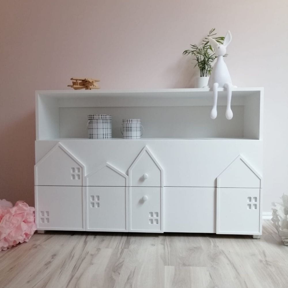 Fronty szuflad zdobią przestrzenne, zminiaturyzowane formy domków, które subtelnie nawiązują do motywu miasta – charakterystycznego dla całej kolekcji. Delikatne, trójwymiarowe detale nadają meblowi unikalnego charakteru, pobudzając dziecięcą wyobraźnię i wprowadzając do wnętrza przyjazną, bajkową atmosferę.