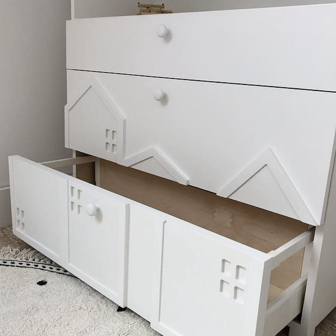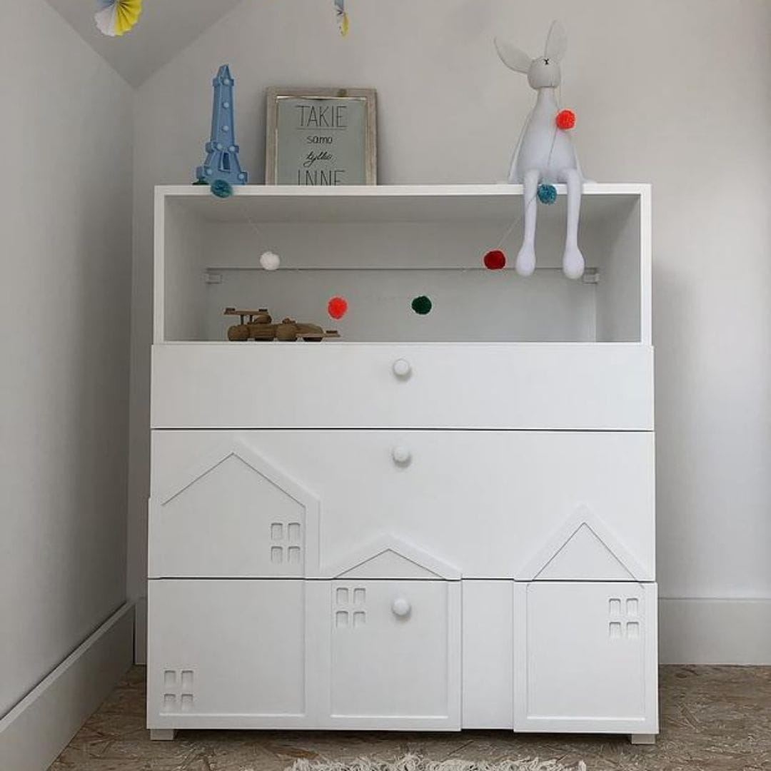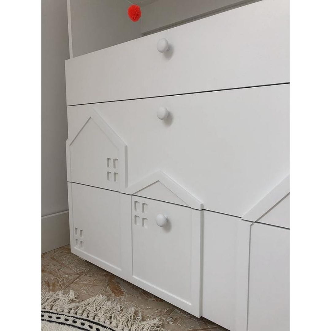 Fronty szuflad zdobią przestrzenne, zminiaturyzowane formy domków, charakterystyczne dla kolekcji Miasto. Delikatne, trójwymiarowe elementy nadają meblowi wyjątkowego uroku i sprawiają, że komoda staje się nie tylko praktycznym wyposażeniem, ale także ozdobą dziecięcego wnętrza.
