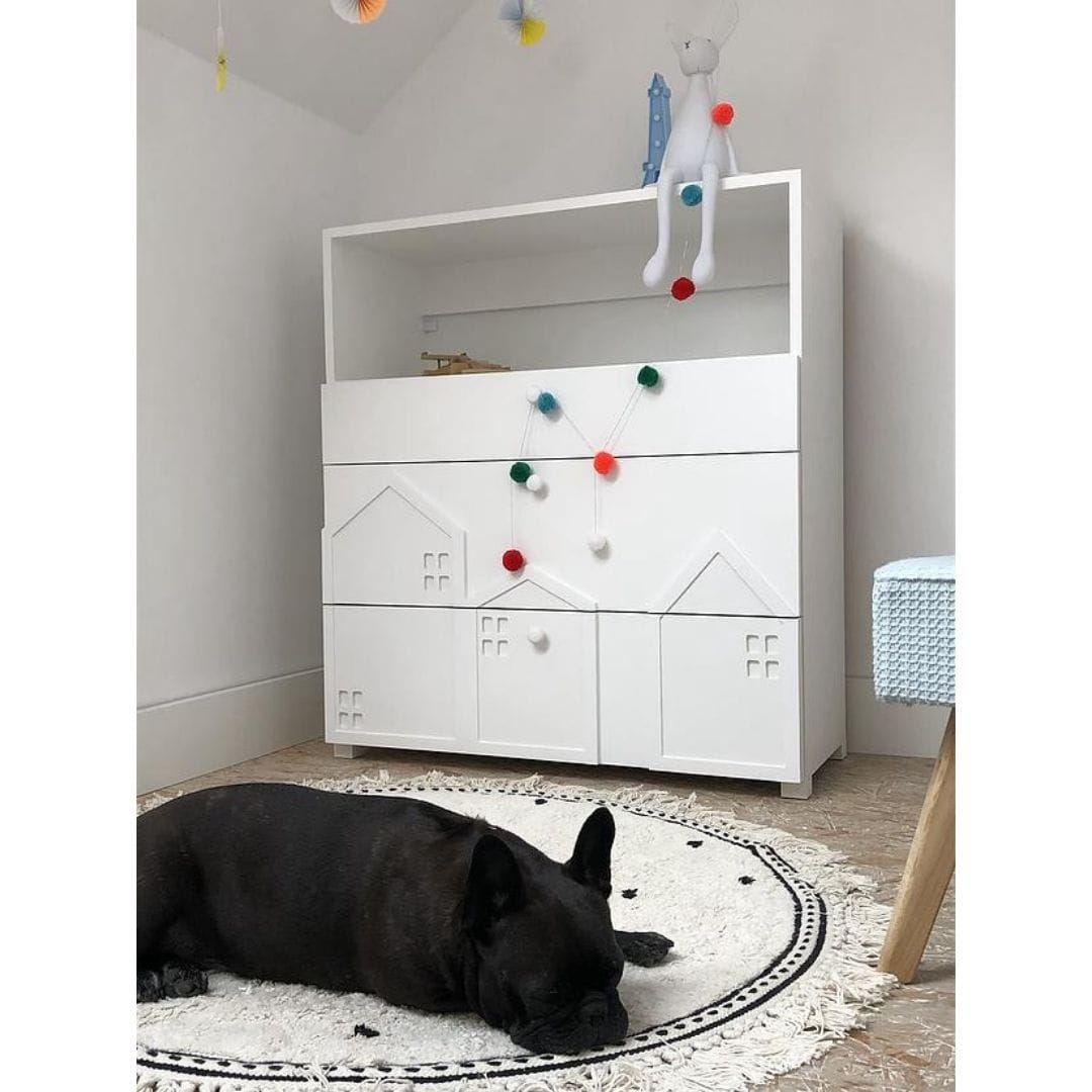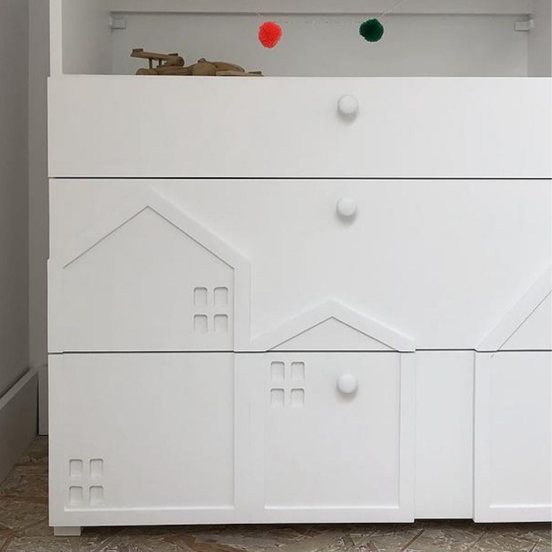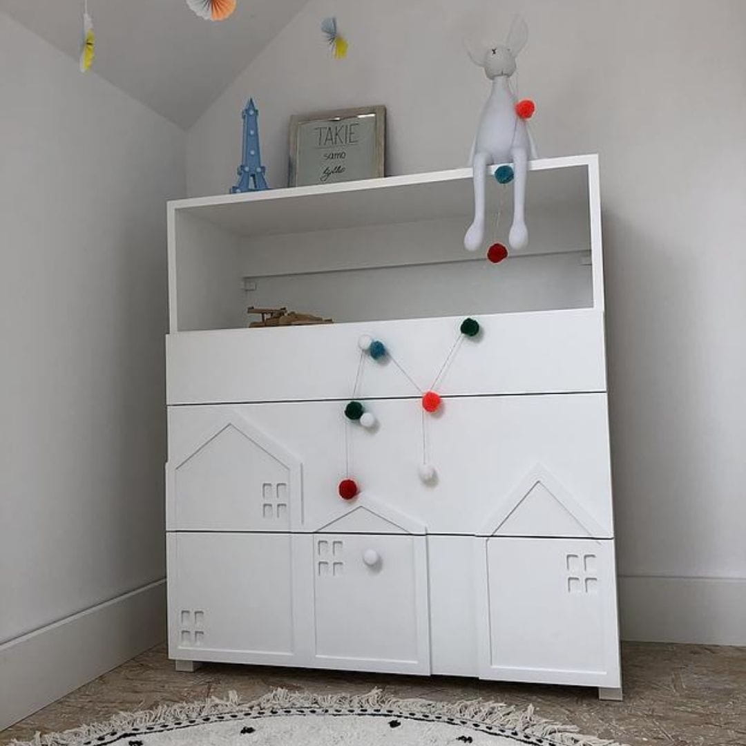Fronty szuflad zdobią przestrzenne, zminiaturyzowane formy domków, charakterystyczne dla kolekcji Miasto. Delikatne, trójwymiarowe elementy nadają meblowi wyjątkowego uroku i sprawiają, że komoda staje się nie tylko praktycznym wyposażeniem, ale także ozdobą dziecięcego wnętrza.