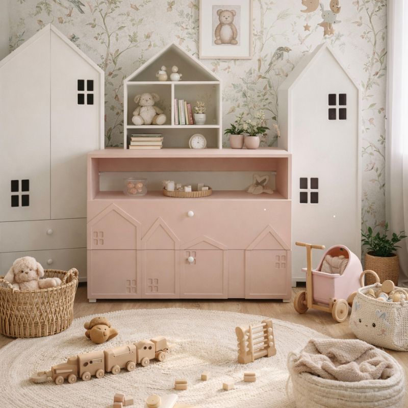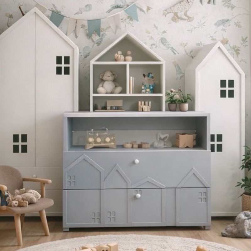 Fronty szuflad zdobią przestrzenne, zminiaturyzowane formy domków, charakterystyczne dla kolekcji Miasto. Delikatne, trójwymiarowe elementy nadają meblowi wyjątkowego uroku i sprawiają, że komoda staje się nie tylko praktycznym wyposażeniem, ale także ozdobą dziecięcego wnętrza.