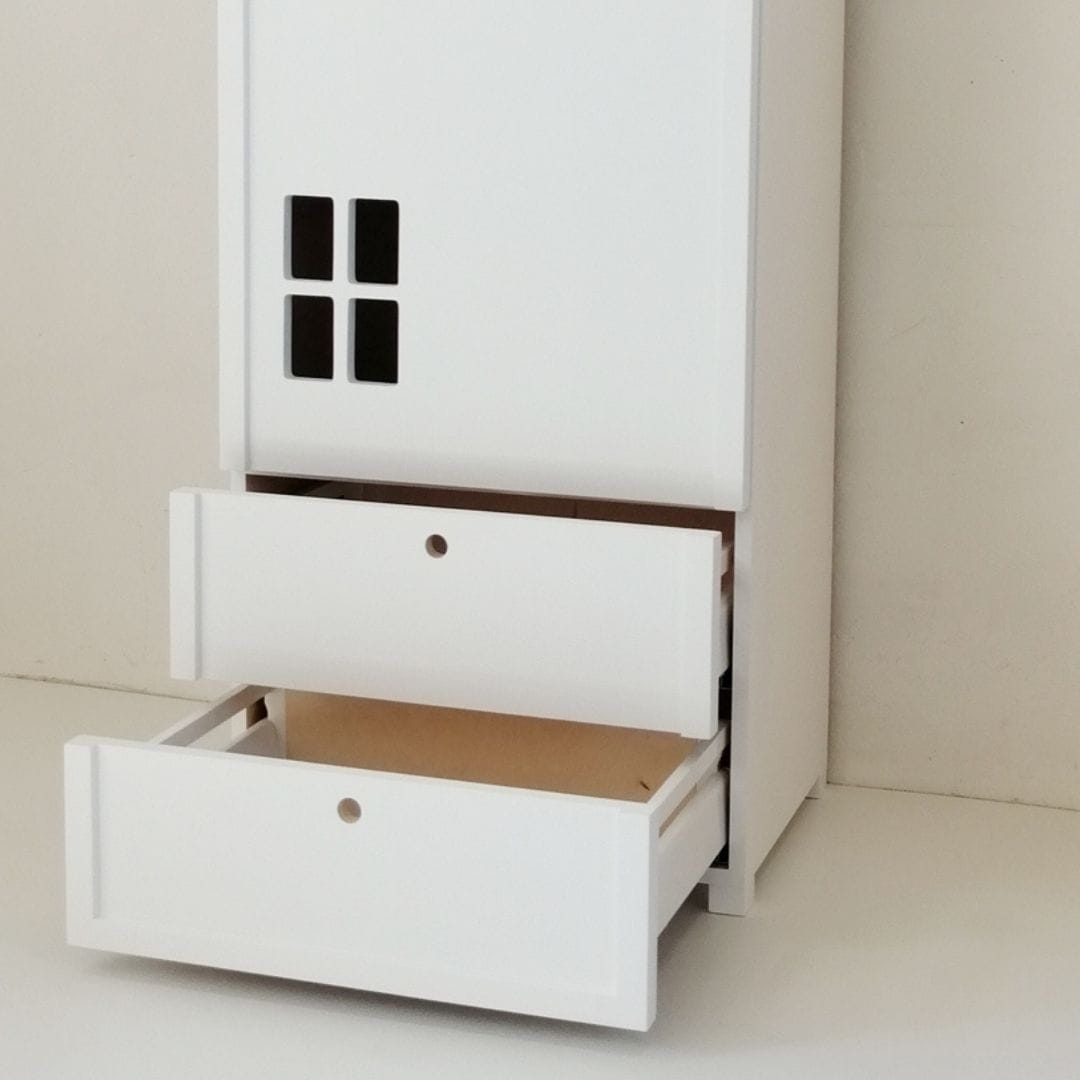 Mebel wyposażony jest w wysokiej jakości nowoczesne szuflady typu modern box z funkcją cichego domyku oraz pełnym wysuwem. Szafa dziecięca wyposażona jest również w drążek do wieszania ubrań.