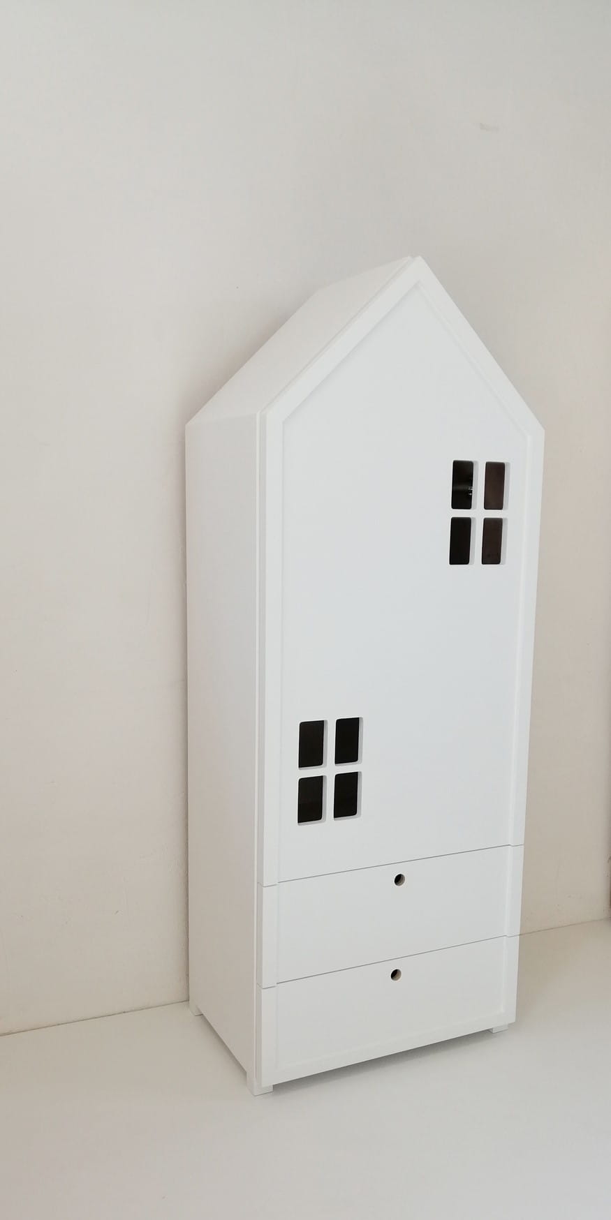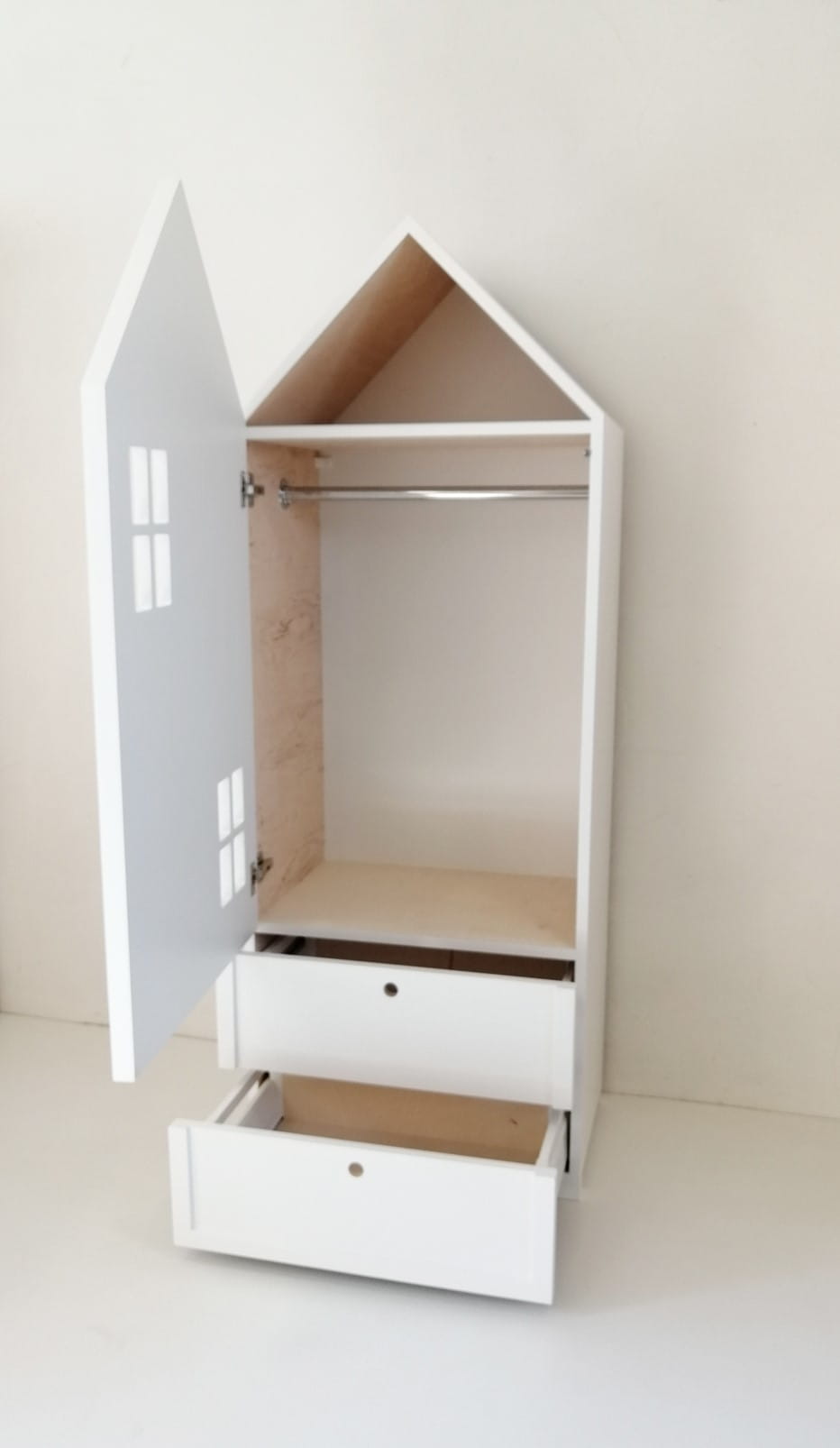 Garderoba dziecięca wykonana ze sklejki liściastej o grubości 18 mm, pomalowana antyalergicznymi farbami akrylowymi do drewna z atestem bezpieczeństwa dla dzieci i poświadczonym certyfikatem. Szafa nie jest pomalowana kolorem od wewnątrz, jedynie zabezpieczona lakierem (w kolorze pomalowany jest cały korpus i drzwi z obu stron).