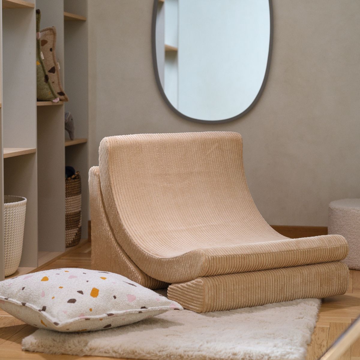 Pufa dla dzieci wykonana jest z wysokiej jakości, grubej tkaniny sztruksowej z certyfikatami OEKO-TEX® i GRS®, który jest produkowany z przetworzonych butelek PET. Miękki sztruks zapewnia niezapomniane wrażenia dotykowe dzięki luksusowej fakturze.