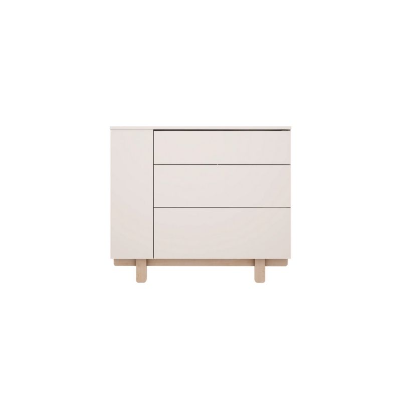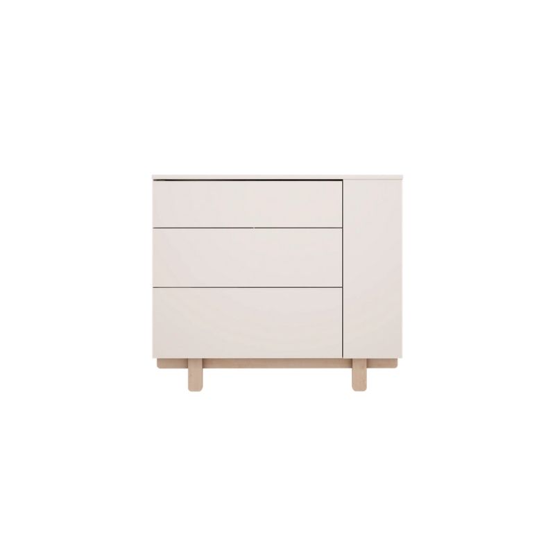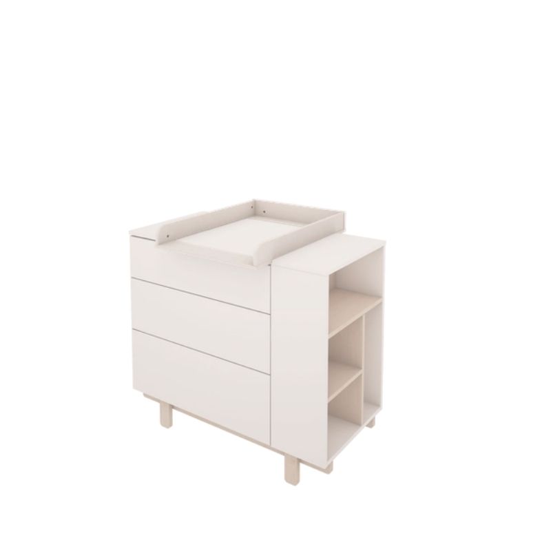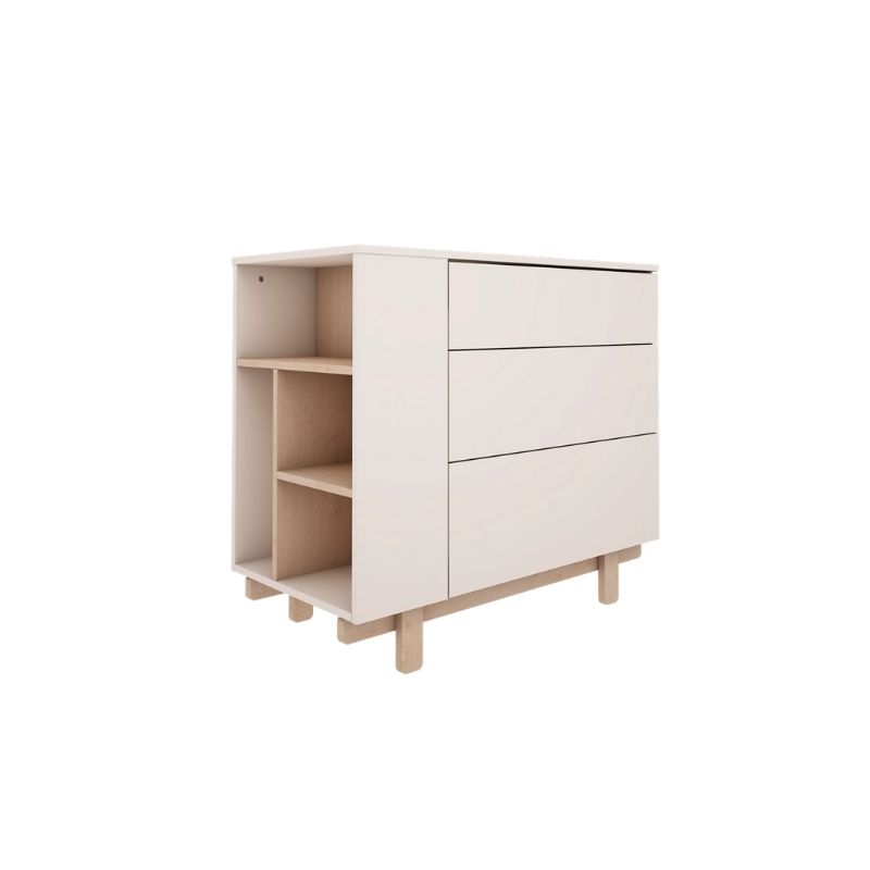 Komoda dla dzieci Wood Luck Design z kolekcji Basic w klasycznym połączeniu złamanej bieli oraz koloru naturalnego drewna. Dzięki trzem pojemnym szufladom zapewnia ona wiele miejsca do przechowywania. Szuflady wyposażone są w wysokiej jakości prowadnice z systemem push-to-open, dzięki którym za pomocą kliknięcia można otworzyć każdą z nich. W boku komody znajduje się regał będący nie tylko dodatkowym miejscem do przechowywania, ale też elementem dekoracyjnym. Regał boczny może być montowany zarówno po prawej jaki i lewej stronie komody.